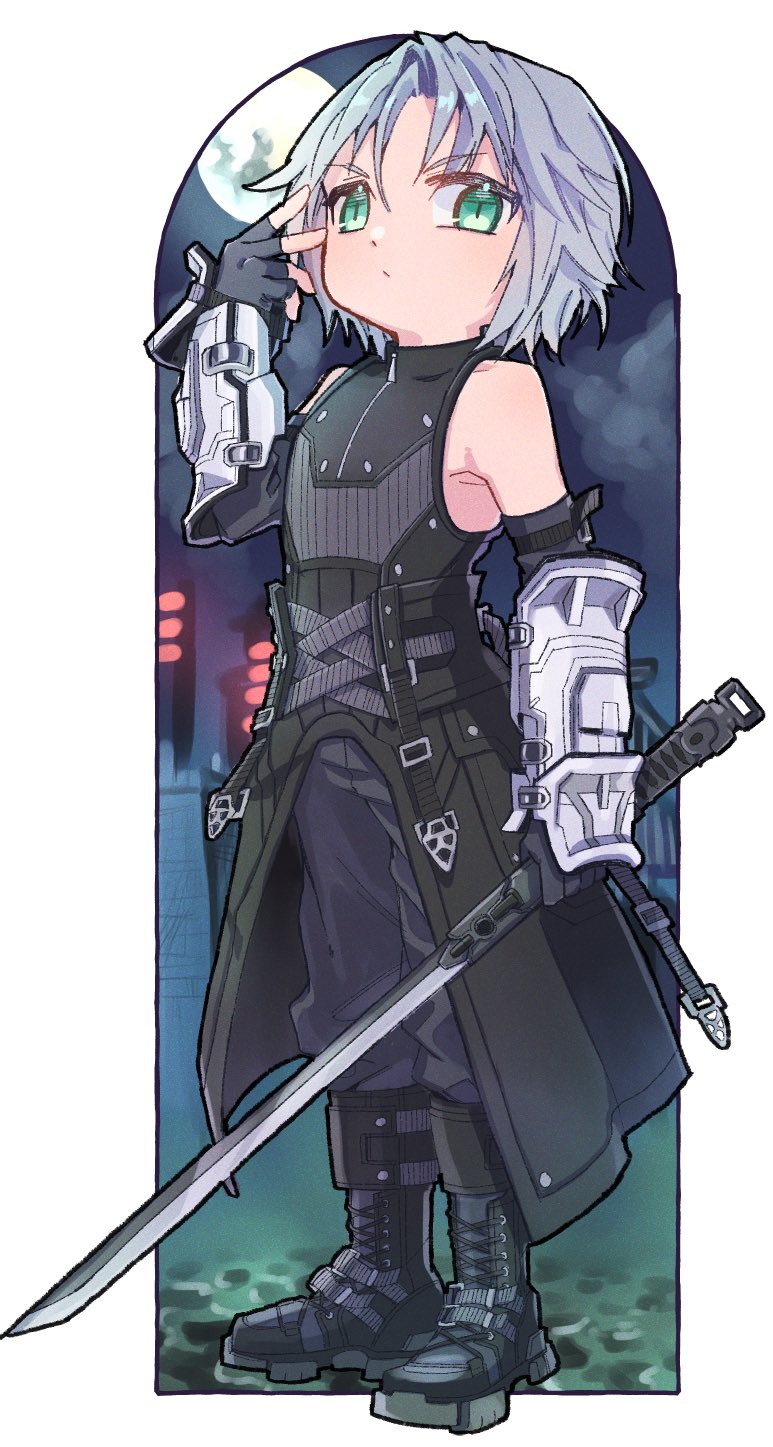 1boy aged_down bare_shoulders black_boots black_gloves black_pants black_shirt boots border elbow_gloves final_fantasy final_fantasy_vii final_fantasy_vii:_ever_crisis full_body full_moon gloves green_eyes grey_hair highres holding holding_sword holding_weapon konbu7733 looking_at_viewer male_focus moon official_alternate_costume pants parted_bangs sephiroth sephiroth_(edged_wings) sephiroth_(ever_crisis) shirt sleeveless sleeveless_turtleneck slit_pupils solo sword turtleneck vambraces weapon white_border