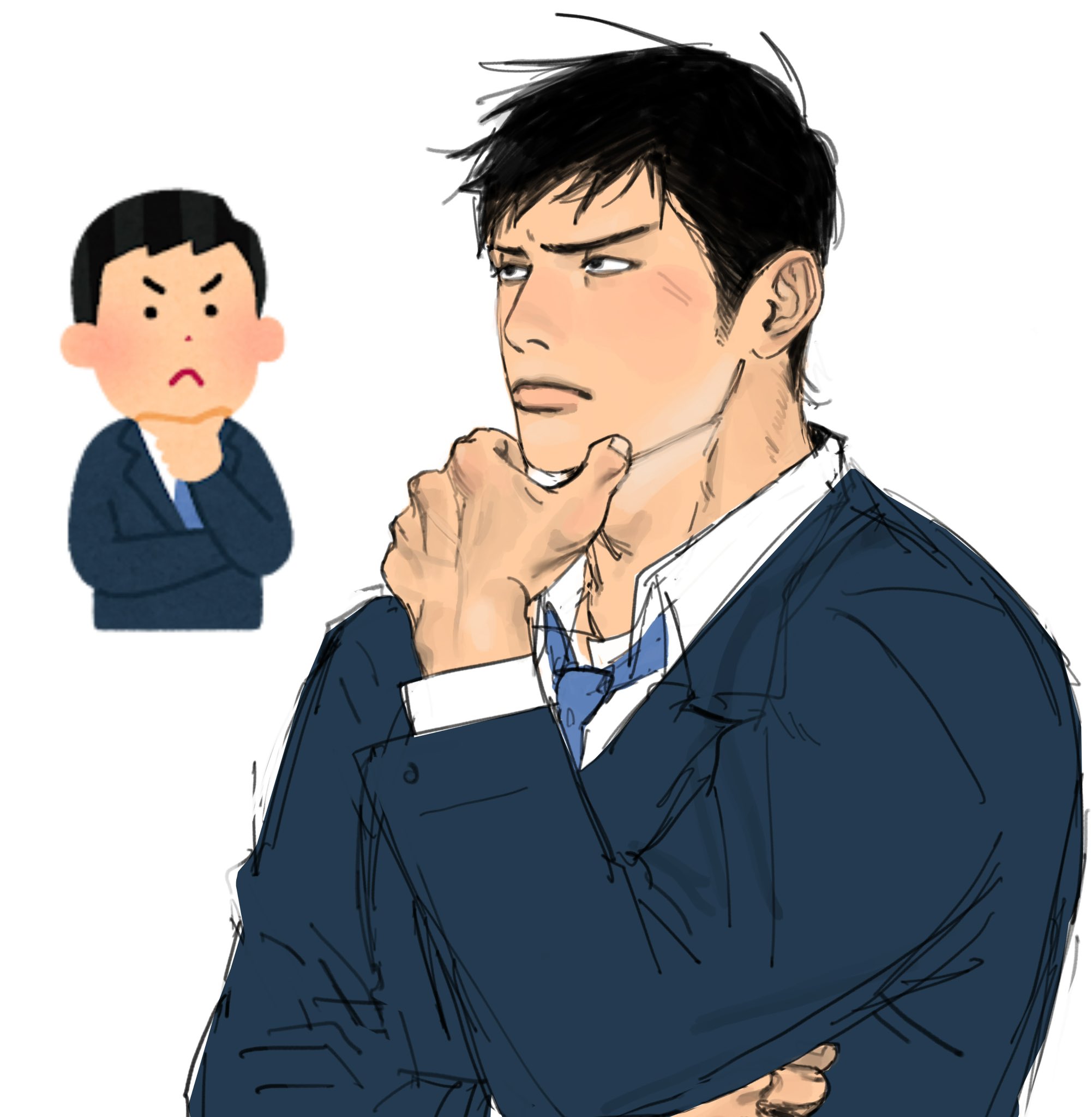 1boy arm_across_waist arm_up black_hair blue_jacket blue_necktie closed_mouth collared_shirt commentary hand_to_own_mouth hashtag-only_commentary highres irasutoya irasutoya_challenge jacket junkboh lapels layered_sleeves long_sleeves looking_up male_focus necktie reference_inset shirt short_hair sideburns simple_background sketch suit_jacket white_background white_shirt wing_collar