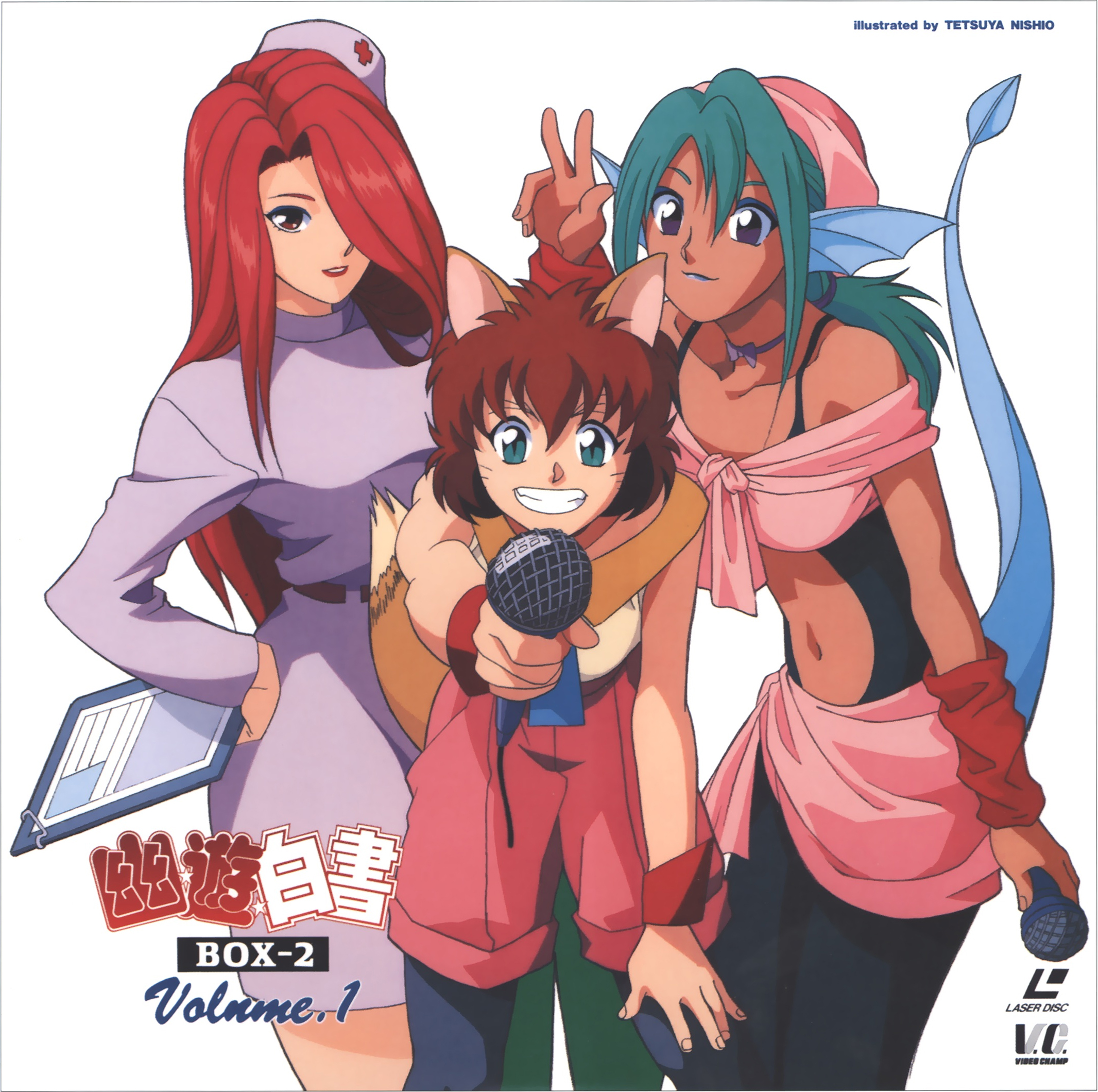 1990s_(style) 3girls animal_ears announcer artist_name breasts brown_hair cat_girl closed_mouth dark-skinned_female dark_skin demon_girl green_hair grin hair_over_one_eye hat highres juri_(yu_yu_hakusho) koto_(yu_yu_hakusho) large_breasts lipstick long_hair looking_at_viewer low_ponytail makeup multiple_girls navel nishio_tetsuya non-web_source nurse nurse_cap official_art open_mouth pink_shirt ponytail red_hair retro_artstyle ruka_(yu_yu_hakusho) scan shirt short_hair simple_background smile tail v white_background wide_hips yuu_yuu_hakusho