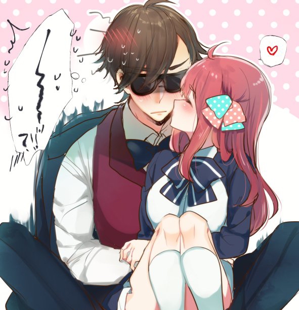 !? 1boy 1girl ahoge blush bow bowtie brown_hair hair_bow hetero jacket jacket_on_shoulders kiss kissing_cheek knees_up long_hair minamoto_sakura mizukikushou polka_dot polka_dot_background polka_dot_bow red_hair red_vest school_uniform short_hair sitting sitting_on_lap sitting_on_person sunglasses surprise_kiss surprised tatsumi_koutarou vest zombie_land_saga