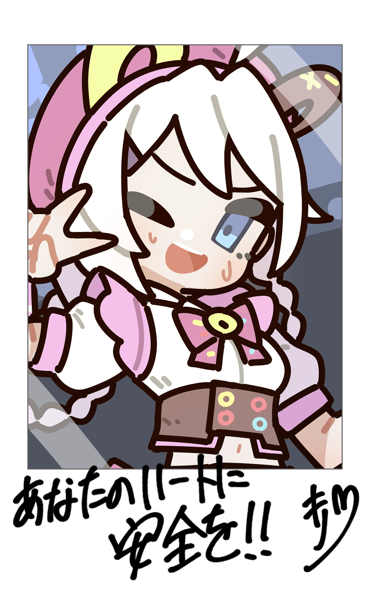 1girl ahoge blue_archive blue_eyes blue_halo bow bowtie braid hair_ornament hairclip halo idol idol_clothes kirino_(blue_archive) kirino_(idol)_(blue_archive) midriff mikaku_(vbvpahw9) multicolored_shirt navel official_alternate_costume official_alternate_hairstyle one_eye_closed open_mouth out_of_frame pink_bow pink_bowtie signature solo sweat swept_bangs teeth translated twin_braids upper_body upper_teeth_only v-shaped_eyebrows white_background