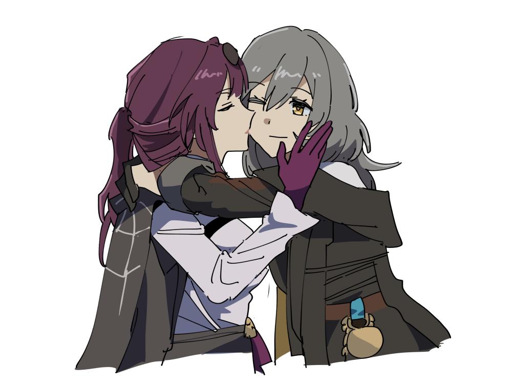 2girls arms_around_neck black_jacket closed_eyes closed_mouth commentary_request gloves grey_hair honkai:_star_rail honkai_(series) hug jacket jacket_on_shoulders kafka_(honkai:_star_rail) kiss kissing_cheek korean_commentary long_hair long_sleeves multiple_girls one_eye_closed ponytail purple_gloves purple_hair shirt simple_background stelle_(honkai:_star_rail) trailblazer_(honkai:_star_rail) udeudede upper_body white_background white_shirt yellow_eyes yuri