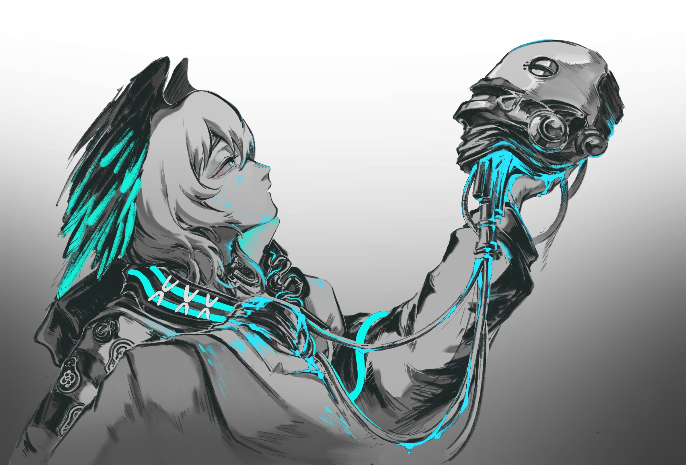 1girl aqua_eyes arknights feathered_wings grey_hair head_wings highres ho'olheyak_(arknights) humanoid_robot jian_min medium_hair robot snake_girl solo tin_man_(arknights) wings