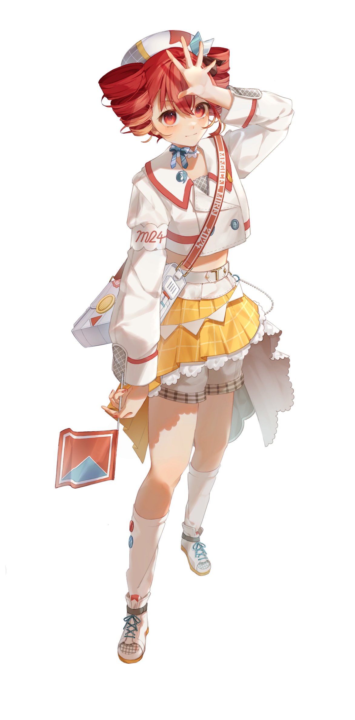 1girl alternate_costume bag buttons closed_mouth cropped_jacket drill_hair flag full_body hand_up hat highres holding holding_flag jacket kasane_teto long_sleeves looking_at_viewer magical_mirai_(vocaloid) midriff_peek pleated_skirt popomine_(popo3ne) red_eyes red_hair shoes shorts shorts_under_skirt shoulder_bag simple_background skirt socks solo standing twin_drills utau white_background white_jacket white_shoes white_socks yellow_skirt
