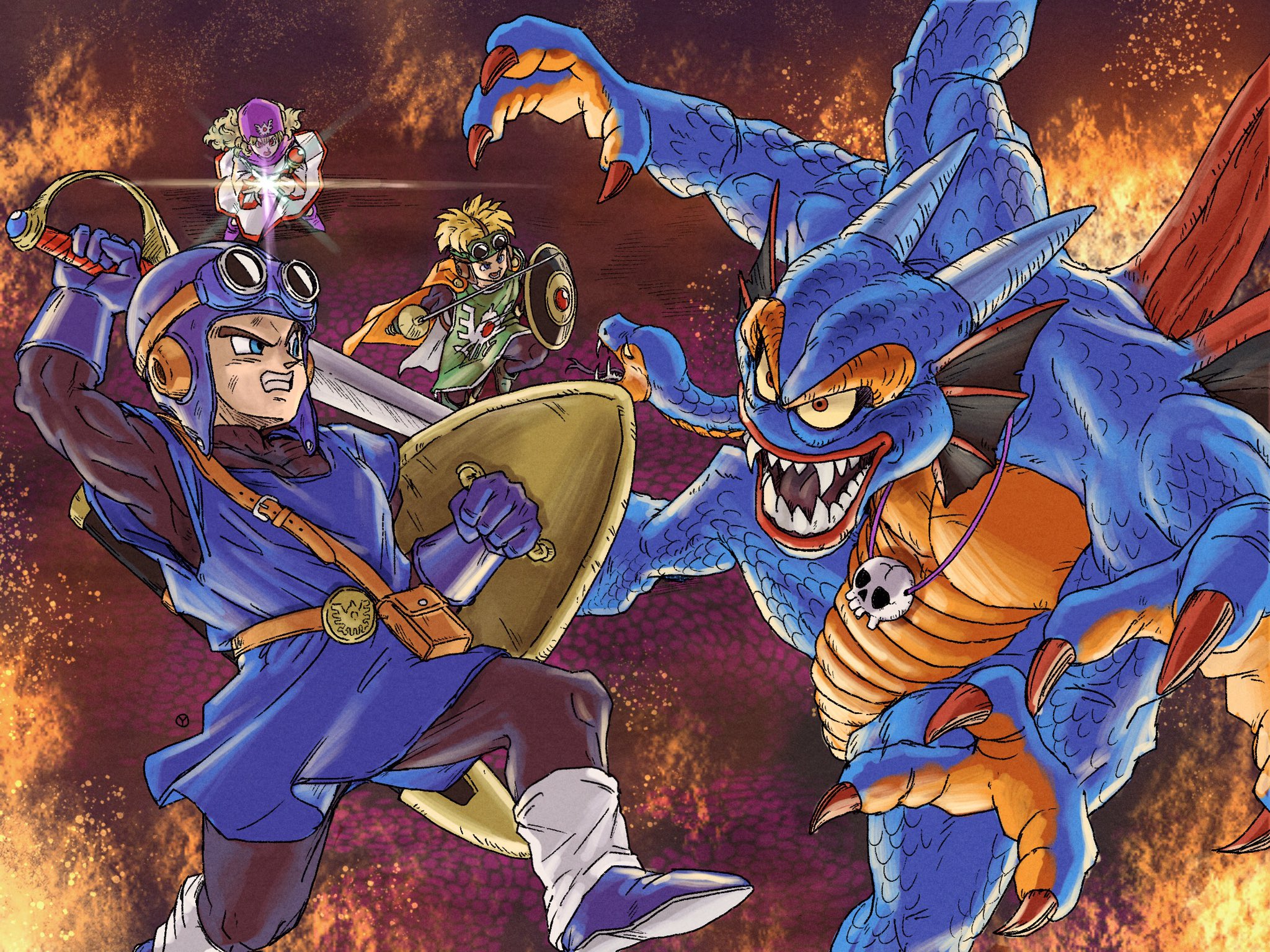 1girl 3boys arm_up blonde_hair blue_eyes blue_gloves blue_scales blue_tunic bone_necklace cape claws clenched_teeth commentary_request cousins curly_hair dirty dirty_face dragon_quest dragon_quest_ii extra_arms fighting floating_cape floating_clothes gloves goggles goggles_on_headwear green_eyes highres holding holding_shield holding_staff holding_sword holding_weapon horns jewelry long_hair looking_at_another monster multiple_boys muscular muscular_male necklace open_mouth orange_cape prince_of_lorasia prince_of_samantoria princess_of_moonbrook rapier red_eyes robe scabbard sharp_teeth sheath shield sidoh skull_necklace snake_tail spiked_hair staff sword tail teeth toriyama_akira_(style) tunic weapon white_robe yuto_sakurai