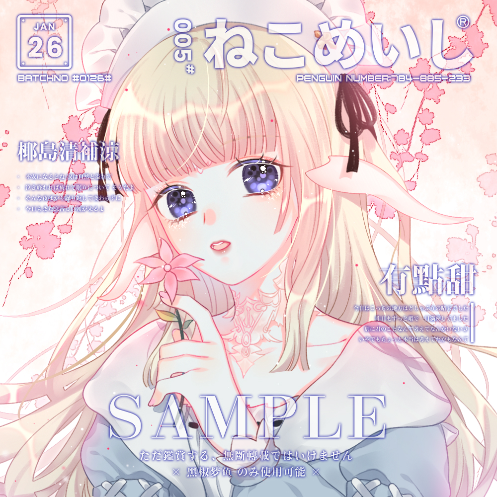 1girl beret black_ribbon blonde_hair blue_eyes blue_jacket blunt_bangs blunt_ends branch chinese_commentary collarbone colored_eyelashes commentary_request commission cross-laced_clothes cross-laced_sleeves dated dated_commentary dongtian_min fingernails flower gradient_background hat hat_ribbon holding holding_flower jacket lipstick long_hair long_sleeves makeup neck_tattoo open_clothes open_jacket open_mouth orange_background original pink_flower puffy_long_sleeves puffy_sleeves red_lips ribbon sample_watermark shirt single_sidelock solo sweater_jacket tattoo teeth too_many_watermarks upper_body upper_teeth_only watermark white_background white_hat white_shirt