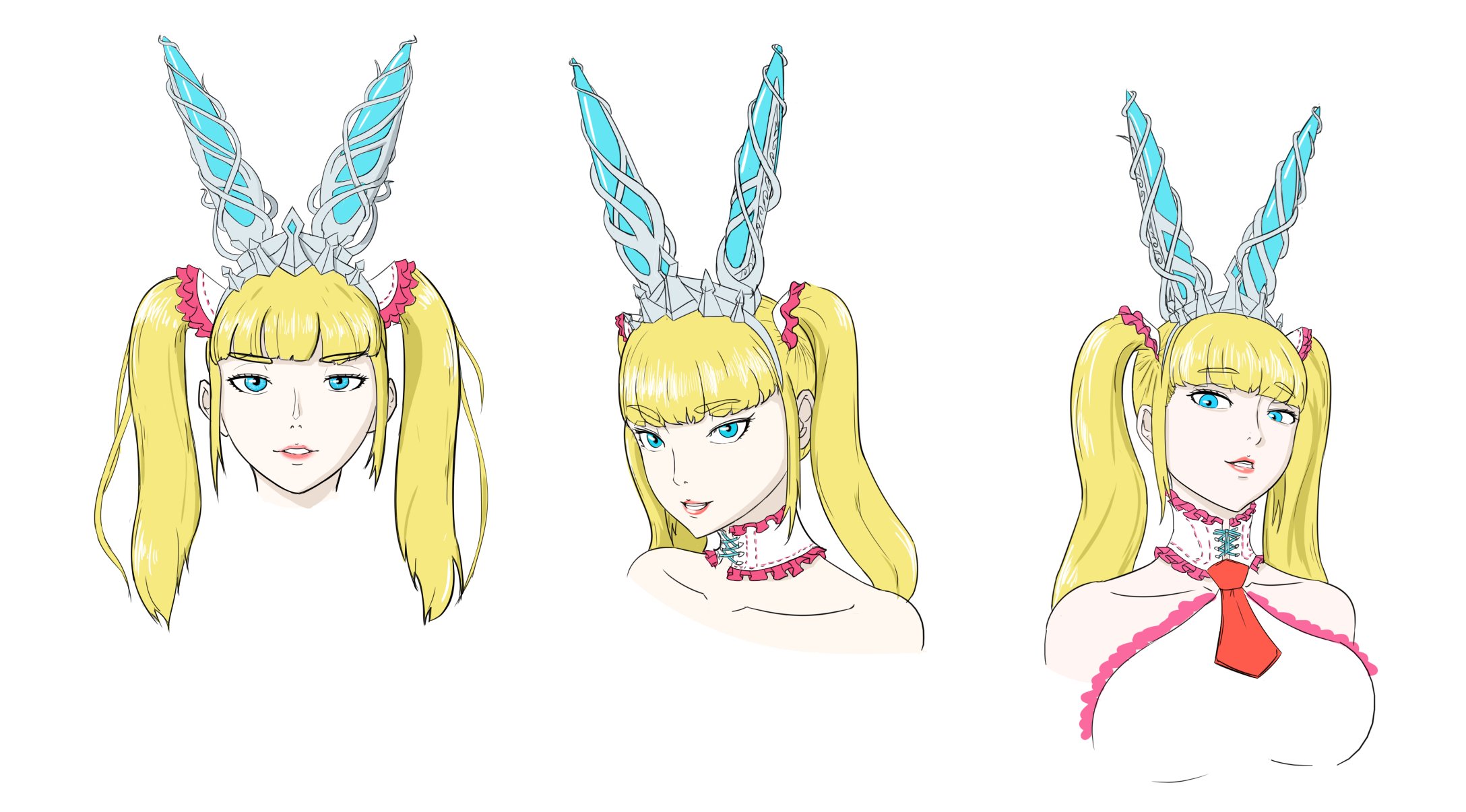 2021 alice_(under_the_witch) blonde_hair blunt_bangs collar commentary cropped_torso multiple_expressions female_focus frilled_collar frilled_hairband frilled_shirt frills grin hairband highres looking_at_viewer pink_lips profile rabbit_ears shirt simple_background smile solo tiara treadml tsurime twintails under_the_witch upper_body white_background white_shirt