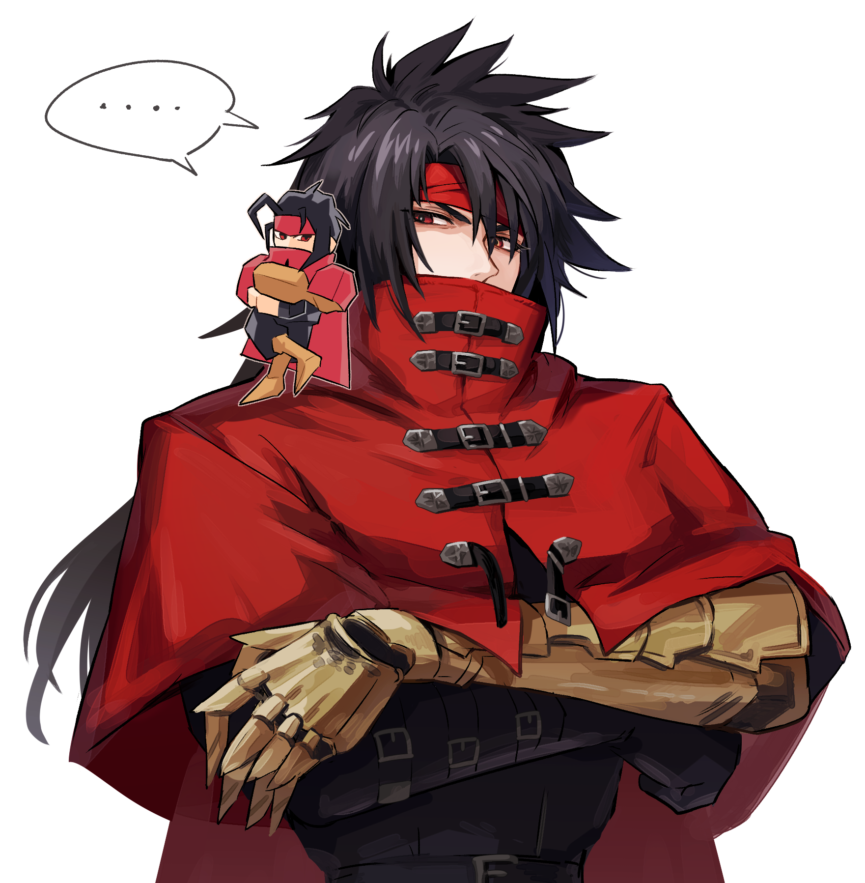 ... 2boys az_(pixiv_108058292) belt_buckle black_gloves black_hair black_jacket buckle cape clawed_gauntlets cloak commentary_request covered_mouth crossed_arms dual_persona final_fantasy final_fantasy_vii gauntlets gloves hair_between_eyes headband highres jacket long_hair low_poly male_focus mini_person miniboy multiple_boys on_shoulder red_cape red_cloak red_eyes red_headband simple_background single_gauntlet single_glove speech_bubble spiked_hair spoken_ellipsis vincent_valentine white_background