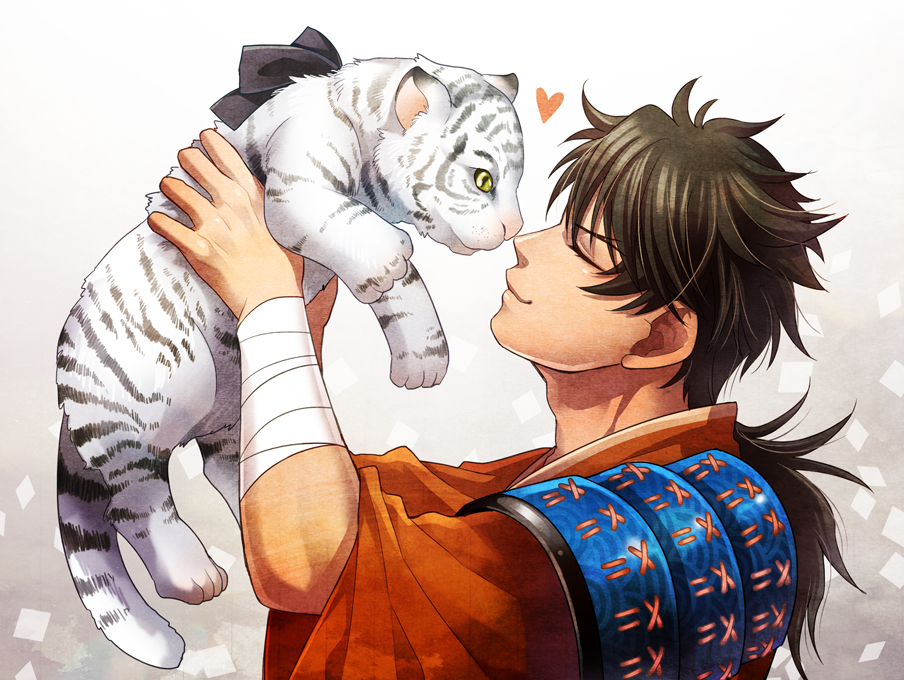 1boy animal armor brown_hair closed_eyes cub eyelashes gradient_background grey_background heart holding holding_animal japanese_armor japanese_clothes jin_akhr kimono male_focus mutsu-no-kami_yoshiyuki orange_kimono shoulder_armor smile sode solo tiger touken_ranbu white_tiger