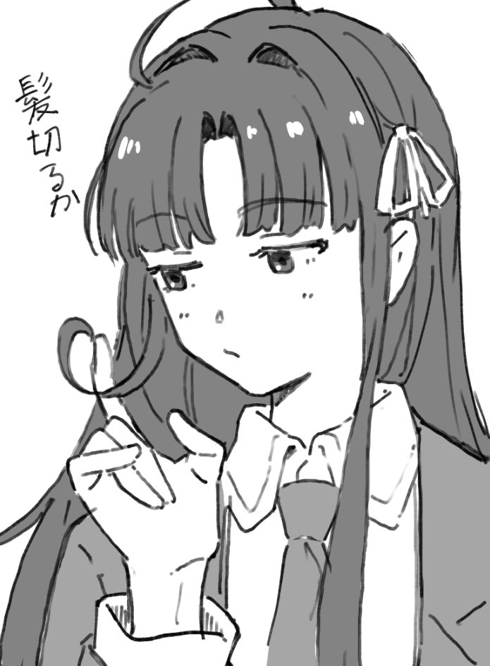 1girl ahoge awa_subaru blush closed_mouth collared_shirt commentary girls_band_cry grey_background greyscale hair_intakes hair_ribbon long_hair long_sleeves monochrome necktie parted_bangs ribbon shirt sidelocks simple_background soko_kikuchi solo translation_request twirling_hair upper_body