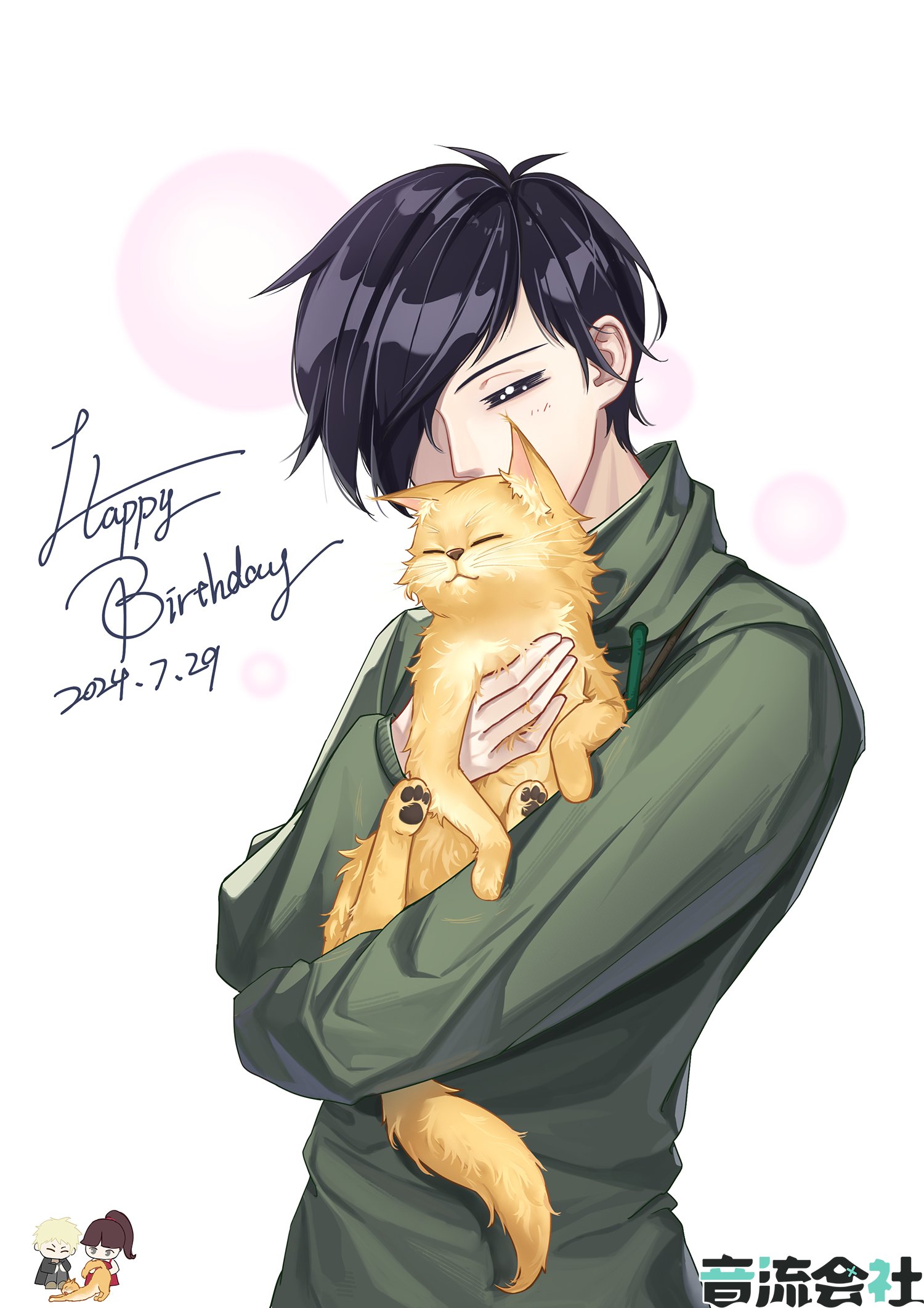 1girl 2boys =_= aiba_ibuki animal artist_request atou_haruki black_hair black_jacket black_pants blonde_hair brown_hair brown_shirt cat chibi closed_eyes commentary_request covered_mouth dated dress english_text green_hoodie guest_art hair_over_one_eye happy happy_birthday highres holding holding_animal holding_cat hood hoodie jacket kumazaki_karen long_sleeves multiple_boys pants pawpads ponytail red_dress saibou_shinkyoku second-party_source shirt short_hair uri_(saibou_shinkyoku) yellow_cat
