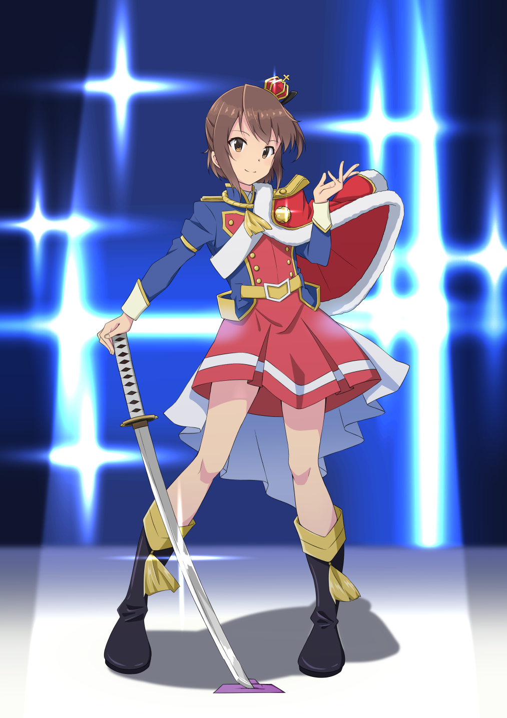 1girl aijo_karen_(cosplay) aijo_karen backlighting belt black_boots blue_jacket boots brown_eyes brown_hair closed_mouth commentary_request cosplay crown etou_kanami full_body fur-trimmed_jacket fur_trim highres holding holding_sword holding_weapon jacket jacket_on_shoulders katana knee_boots layered_skirt long_sleeves looking_at_viewer mini_crown motsutoko red_jacket red_skirt sash shadow short_hair shoujo_kageki_revue_starlight skirt smile solo stage stage_lights standing sword toji_no_miko weapon yellow_belt