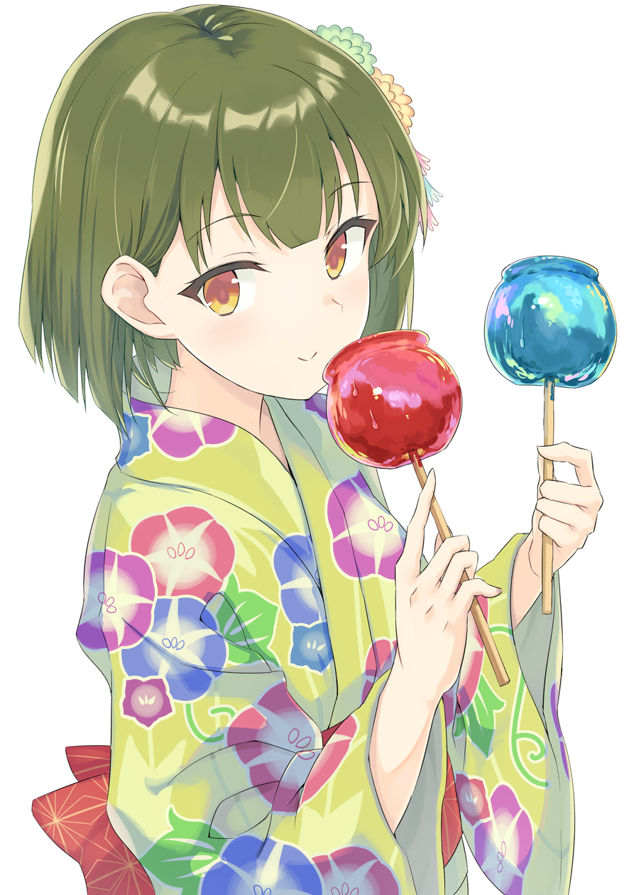 1girl ban_tsugumi brown_eyes candy_apple closed_mouth commentary_request floral_print floral_print_kimono flower food green_hair green_kimono hair_flower hair_ornament hands_up highres holding holding_candy_apple holding_food japanese_clothes kimono long_sleeves looking_at_viewer obi pera print_kimono sash short_hair smile solo standing toji_no_miko white_background wide_sleeves yukata