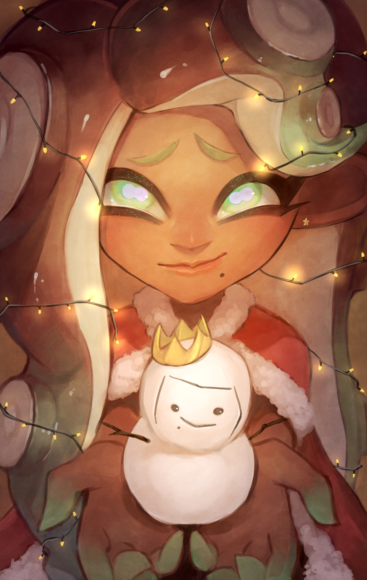 1girl alternate_costume aqua_eyes aqua_hair brown_hair cape cephalopod_eyes character_snowman close-up closed_mouth colored_extremities commentary_request crown dark-skinned_female dark_skin earrings fur-trimmed_cape fur_trim furrowed_brow gradient_hair highres horizontal_pupils jewelry long_hair looking_at_viewer marina_(splatoon) mole mole_under_mouth multicolored_hair nintendo octoling outstretched_arms parted_bangs pearl_(splatoon) pink_pupils red_cape sizu smile snowman solo splatoon_(series) splatoon_2 star_(symbol) star_earrings string_of_light_bulbs suction_cups tentacle_hair two-tone_hair