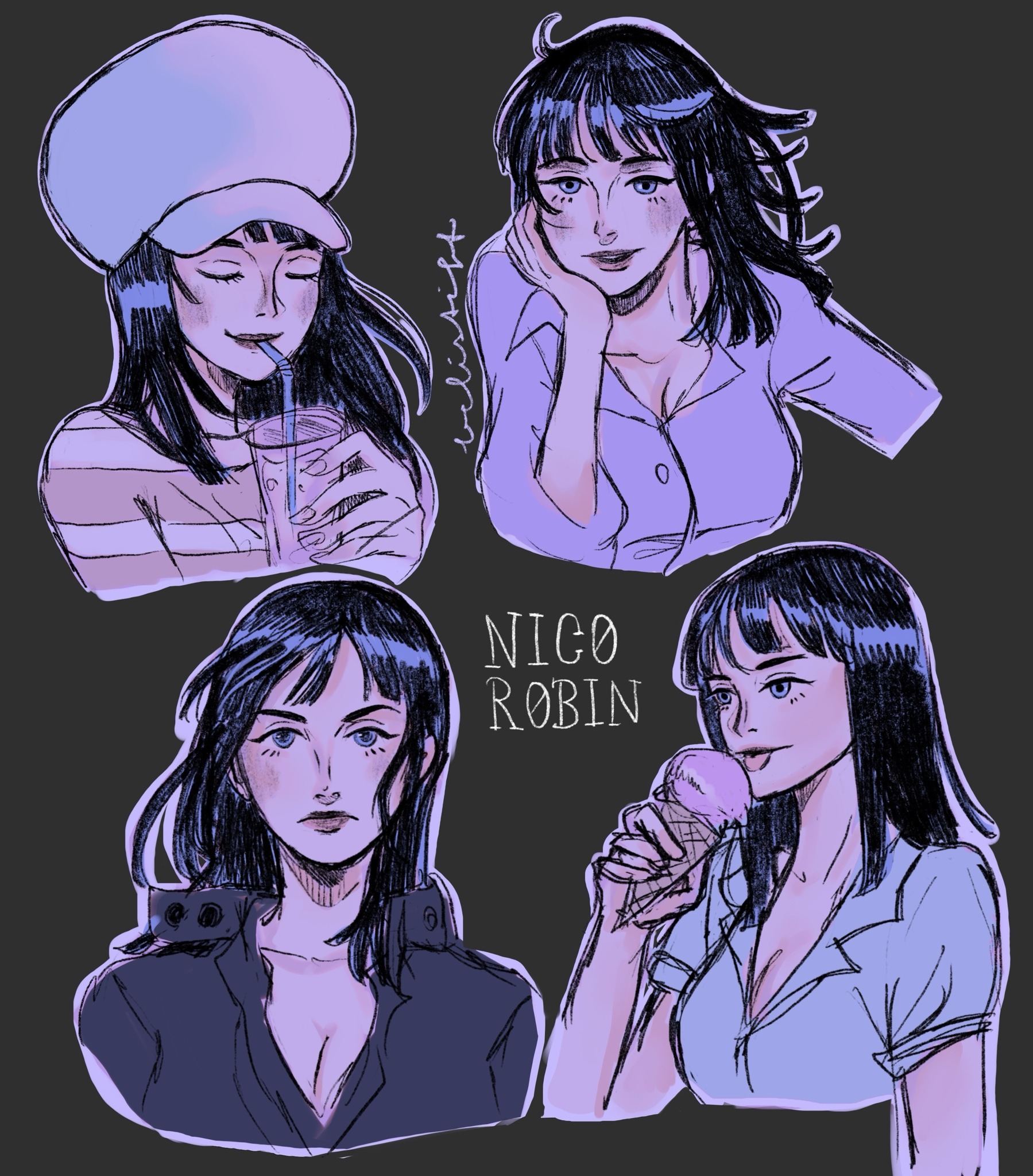 1girl belistift black_hair blunt_bangs character_name closed_eyes collared_shirt commentary cropped_arm cropped_torso derivative_work drinking_straw eating english_commentary floating_hair food grey_background hat highres ice_cream light_smile limited_palette looking_at_viewer medium_hair multiple_views nico_robin nico_robin_(alabasta) nico_robin_(water_7) one_piece screenshot_redraw shirt simple_background white_hat white_shirt