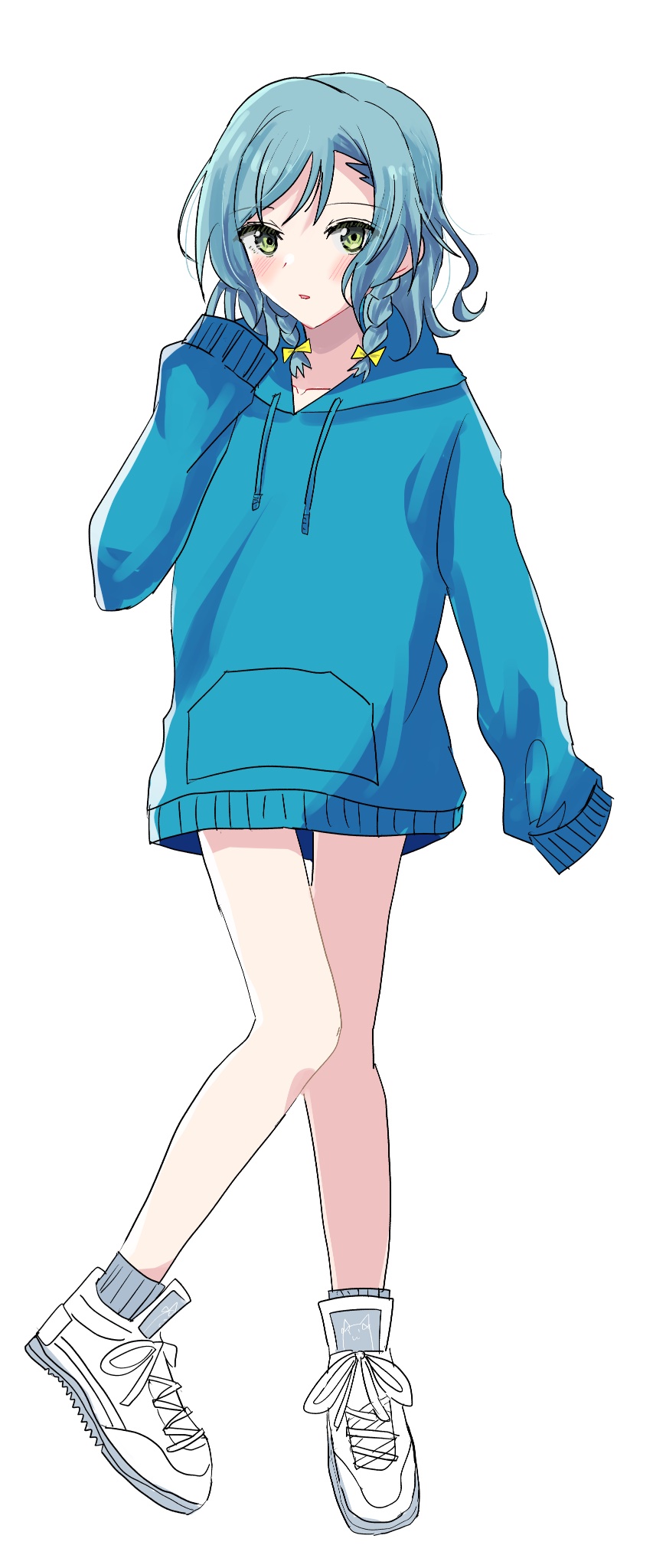 1girl bang_dream! bang_dream!_girls_band_party! blue_hair blue_hoodie blush braid commentary full_body green_eyes grey_socks guildlay highres hikawa_hina hood hood_down hoodie long_sleeves looking_at_viewer medium_hair open_mouth side_braids simple_background sleeves_past_fingers sleeves_past_wrists socks solo white_background white_footwear