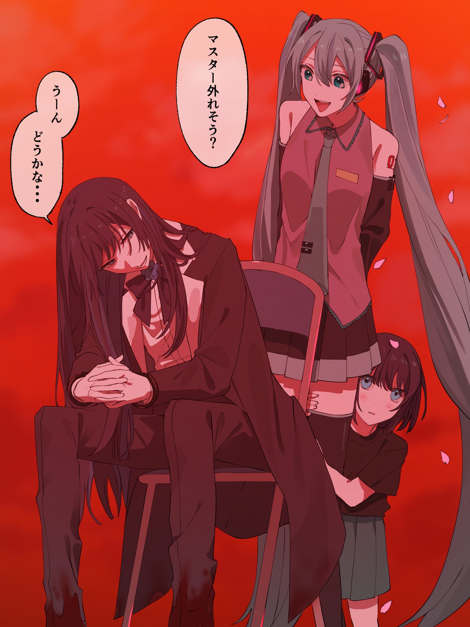 3girls ado_(utaite) age_progression aqua_hair aqua_necktie arms_behind_back black_bow black_bowtie black_coat black_hair black_pants black_shirt black_skirt black_thighhighs blue_eyes blue_flower blue_rose blue_skirt blush bow bowtie brooch chair chando_(ado) cherry_blossoms child coat collared_shirt detached_sleeves dress_shirt flower flower_brooch gloves grey_shirt hair_between_eyes hatsune_miku highres hugging_another's_leg interlocked_fingers jewelry long_hair miyuu_3333 mole mole_under_eye multiple_girls necktie open_clothes open_coat open_mouth own_hands_together pants petals pink_petals pleated_skirt red_background rose shirt shoka_(ado) short_hair short_sleeves sitting skirt standing teeth thighhighs tie_clip twintails upper_teeth_only utaite very_long_hair vocaloid white_gloves white_shirt zettai_ryouiki