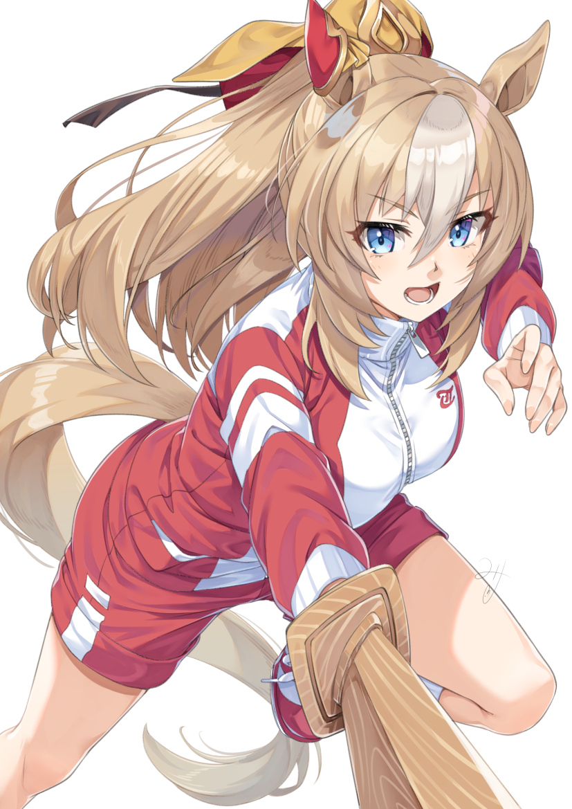 1girl animal_ears blue_eyes breasts commentary_request durandal_(umamusume) grey_hair gym_shorts hair_between_eyes holding holding_sword holding_weapon horse_ears horse_girl horse_tail jacket light_brown_hair long_hair looking_at_viewer medium_breasts miri_(ago550421) multicolored_hair open_mouth ponytail red_jacket red_shorts shorts simple_background solo standing standing_on_one_leg sword tail track_jacket two-tone_hair umamusume v-shaped_eyebrows very_long_hair weapon white_background wooden_sword