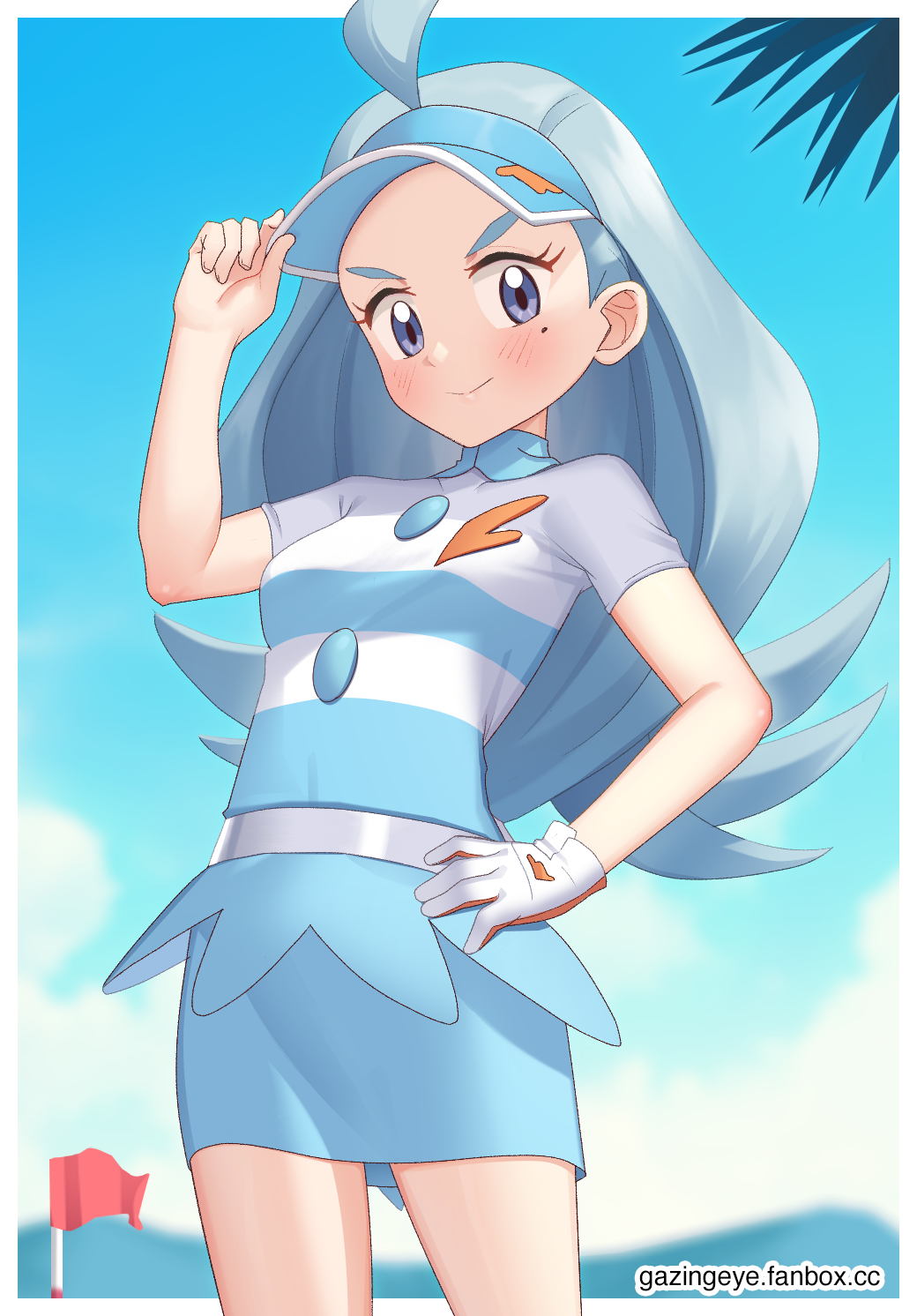 1girl ahoge blue_eyes blue_hat blue_skirt blush border closed_mouth commentary cowboy_shot day eyelashes flag gazing_eye gloves grey_hair hand_on_headwear hand_on_own_hip hand_up hat highres kahili_(pokemon) long_hair looking_at_viewer mole mole_under_eye nintendo outdoors pokemon pokemon_sun_and_moon shirt short_sleeves skirt sky smile solo striped_clothes striped_shirt textless_version visor_cap watermark web_address white_border white_gloves