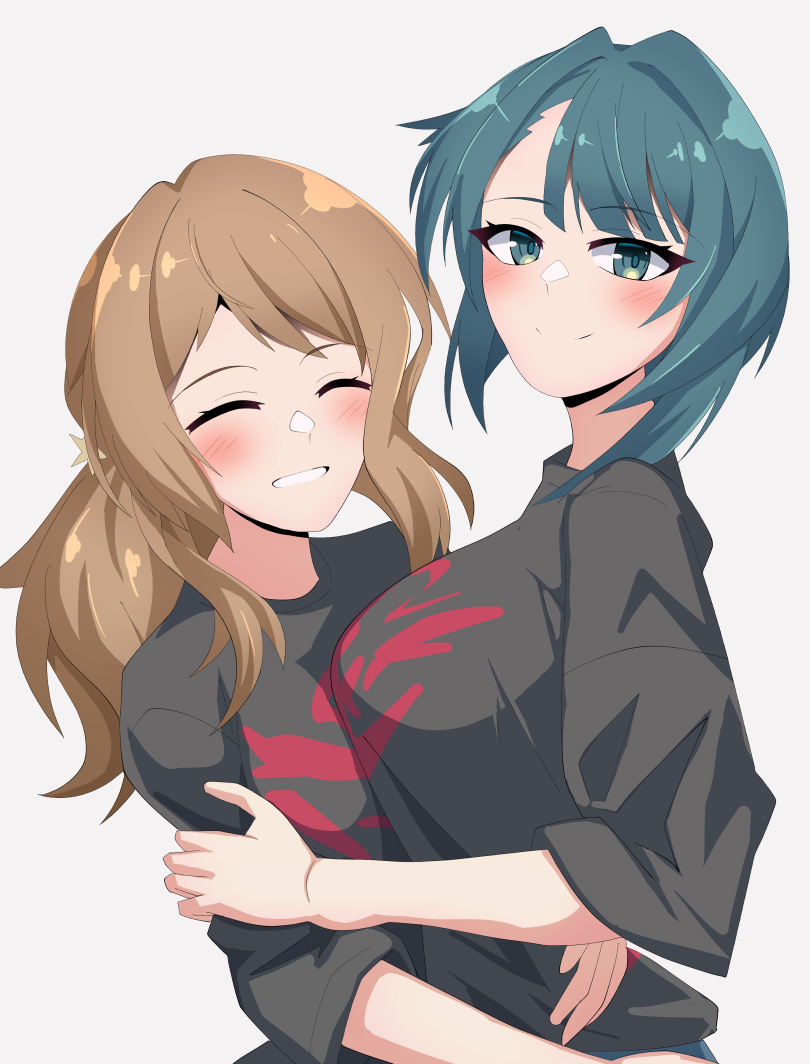 2girls ^_^ aizawa_kazuha assault_lily asymmetrical_docking asymmetrical_hair black_shirt blue_eyes blue_hair blush breast_press breasts brown_hair closed_eyes closed_mouth commentary_request from_side grey_background hair_ornament hand_on_another's_arm hug iijima_renka ishitsuma_canon large_breasts looking_at_viewer looking_to_the_side low_ponytail multiple_girls ponytail print_shirt shirt side_ponytail simple_background smile star_(symbol) star_hair_ornament three-quarter_sleeves upper_body