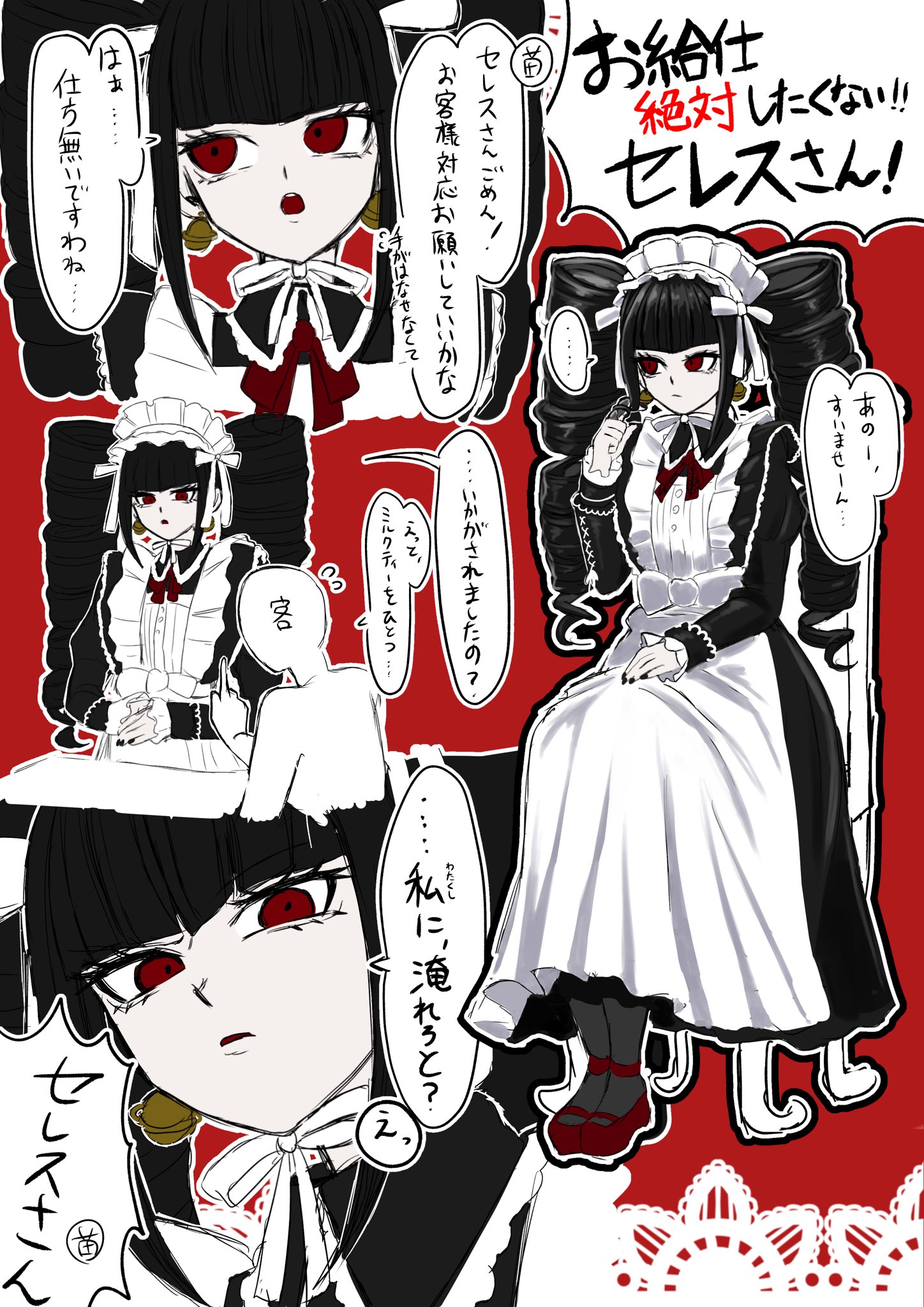 1girl :o apron black_dress black_hair black_nails black_pantyhose celestia_ludenberg chair danganronpa:_trigger_happy_havoc danganronpa_(series) dress earrings full_body hand_up headdress highres jewelry long_hair long_sleeves maid_apron mozuku_(iiiiiiimomo) multiple_views nail_polish pantyhose red_background red_eyes red_footwear sitting speech_bubble translation_request white_apron white_background