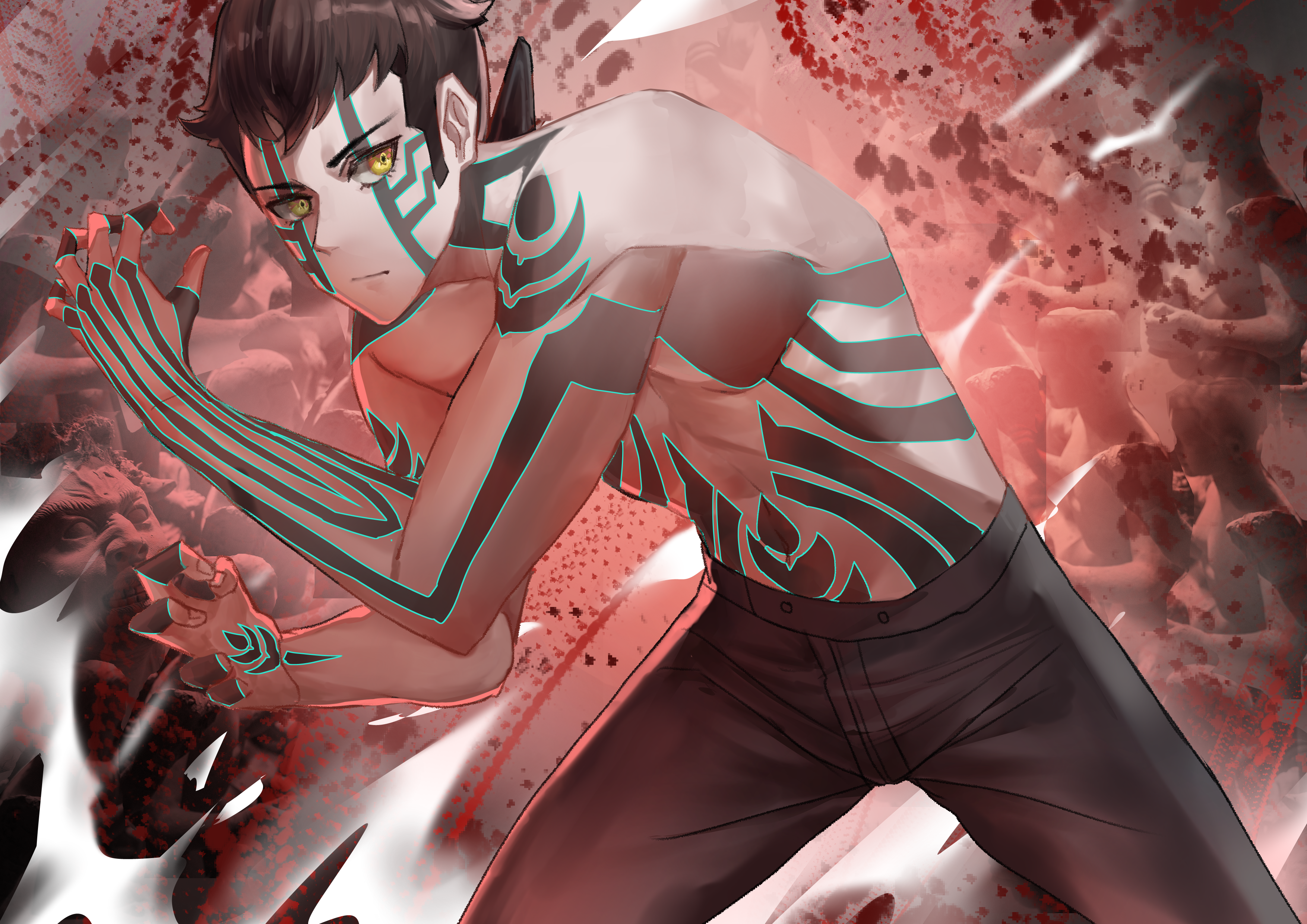 1boy abs absurdres black_hair brown_hair demi-fiend full-body_tattoo highres looking_at_viewer male_focus nekotori_(nekotori221) shin_megami_tensei shin_megami_tensei_iii:_nocturne short_hair shorts solo tattoo topless_male yellow_eyes