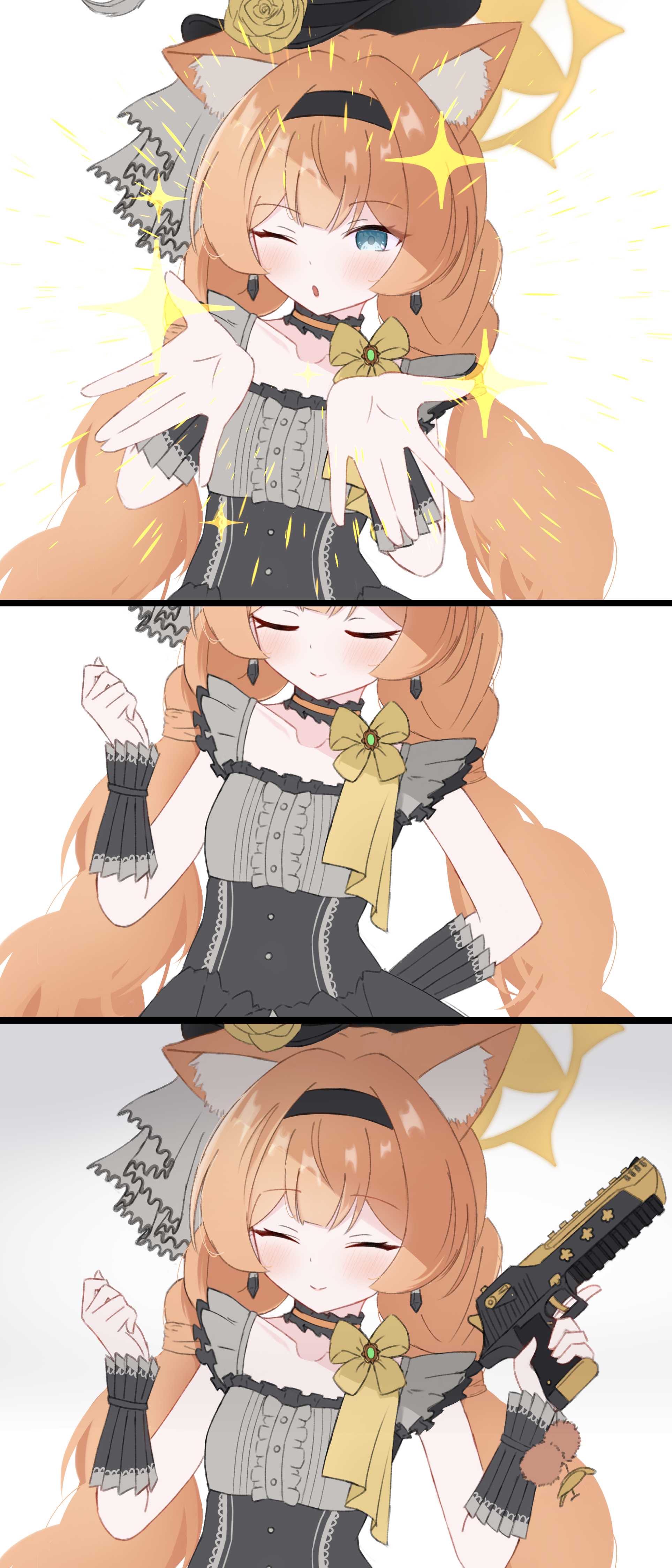 1girl absurdres animal_ear_fluff animal_ears arm_behind_back black_dress black_headband blue_archive blue_eyes blush closed_eyes dress earrings flower flower_as_hat frilled_dress frills gun halo hat headband highres holding holding_gun holding_weapon idol idol_clothes jewelry long_hair mari_(blue_archive) mari_(idol)_(blue_archive) multiple_views official_alternate_costume official_alternate_hairstyle one_eye_closed open_mouth orange_hair ribbon santinn shaded_face simple_background smile sparkle top_hat twintails weapon white_background yellow_flower yellow_halo yellow_ribbon