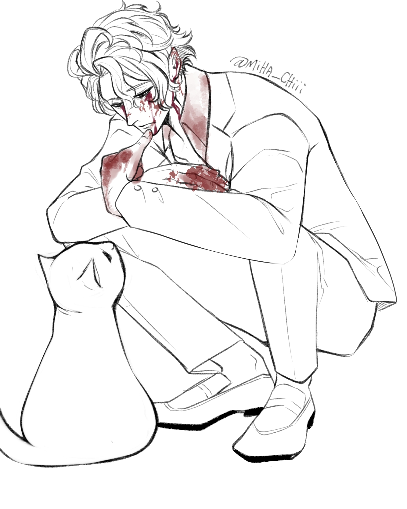 1boy ahoge blood blood_on_clothes blood_on_face blood_on_hands cat collarbone expressionless full_body greyscale hair_between_eyes half-closed_eyes highres jitome long_sleeves looking_at_animal looking_down male_focus monochrome pointy_ears poseidon_(shuumatsu_no_valkyrie) short_hair shuumatsu_no_valkyrie solo squatting tuxedo