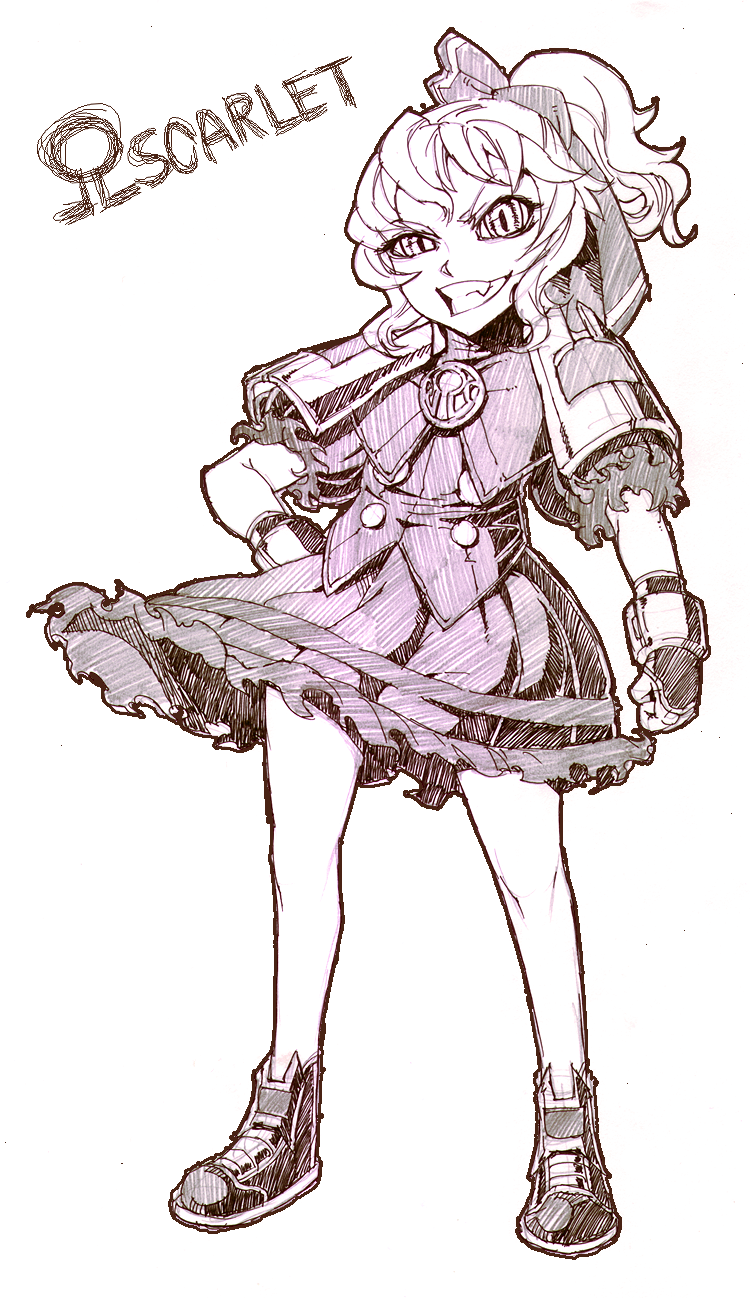1girl alternate_art_style alternate_hairstyle anti-earth_bomb character_name fang fingerless_gloves full_body gloves hand_on_own_hip highres looking_at_viewer medium_hair monochrome open_mouth ponytail puffy_short_sleeves puffy_sleeves remilia_scarlet shoes short_sleeves skirt touhou vest white_background