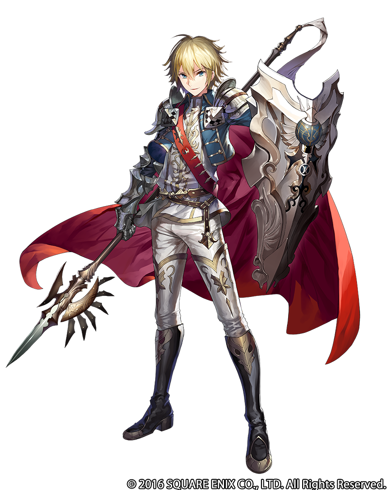 1boy armor axe blonde_hair blue_eyes cape full_body gaou_(umaiyo_puyoman) grimms_notes holding holding_axe holding_weapon male_focus official_art open_mouth prince_wald_(grimms_notes) red_cape shield short_hair simple_background smile solo weapon white_background