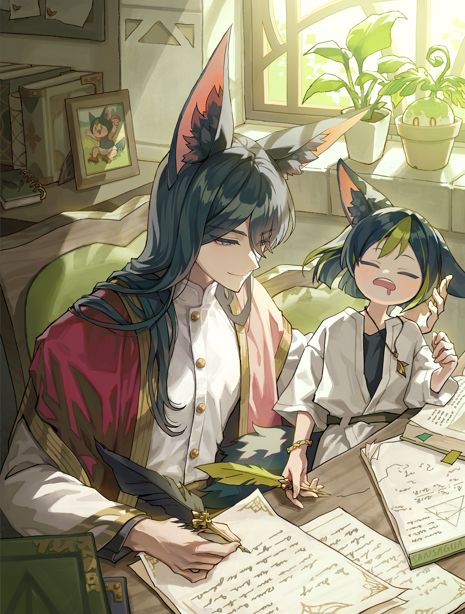 2boys aged_down alternate_costume animal_ears black_hair book chair child closed_eyes closed_mouth collared_shirt commentary drooling english_commentary father_and_child father_and_son fox_boy fox_ears genshin_impact highres holding holding_quill indoors jewelry long_hair male_focus mouth_drool multicolored_hair multiple_boys necklace paper parent_and_child quill sansaguaart shirt short_hair sitting sleeping streaked_hair table teeth tighnari's_father_(genshin_impact) tighnari_(genshin_impact) upper_teeth_only
