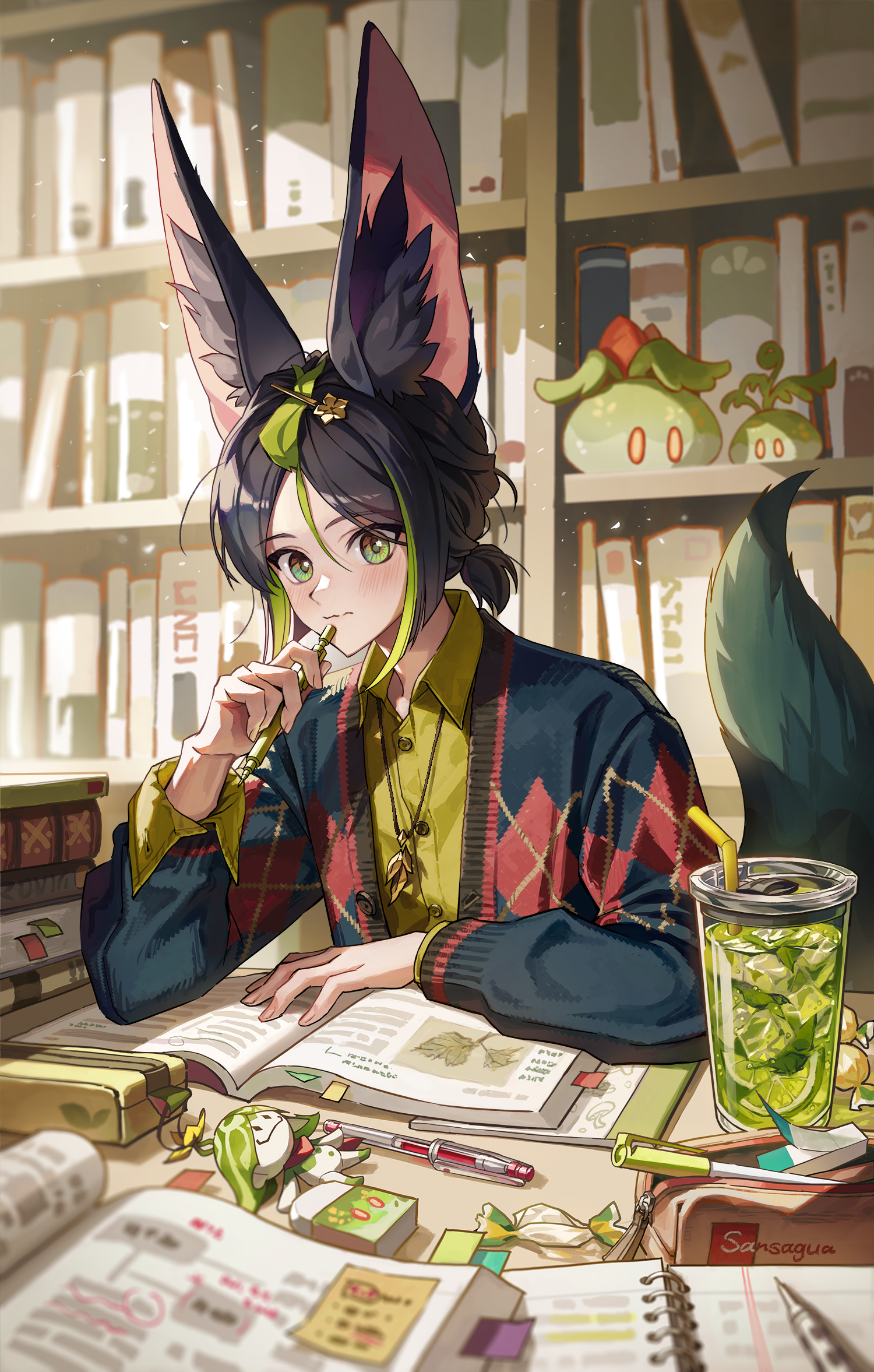 1boy animal_ear_fluff animal_ears aranara_(genshin_impact) artist_name black_hair book closed_mouth commentary earrings english_commentary flower fox_boy fox_ears fox_tail genshin_impact gloves green_eyes green_hair hair_between_eyes highres jewelry looking_at_viewer male_focus multicolored_hair multicolored_sweater pen sansaguaart short_hair slime_(genshin_impact) solo streaked_hair sweater tail tighnari_(genshin_impact)