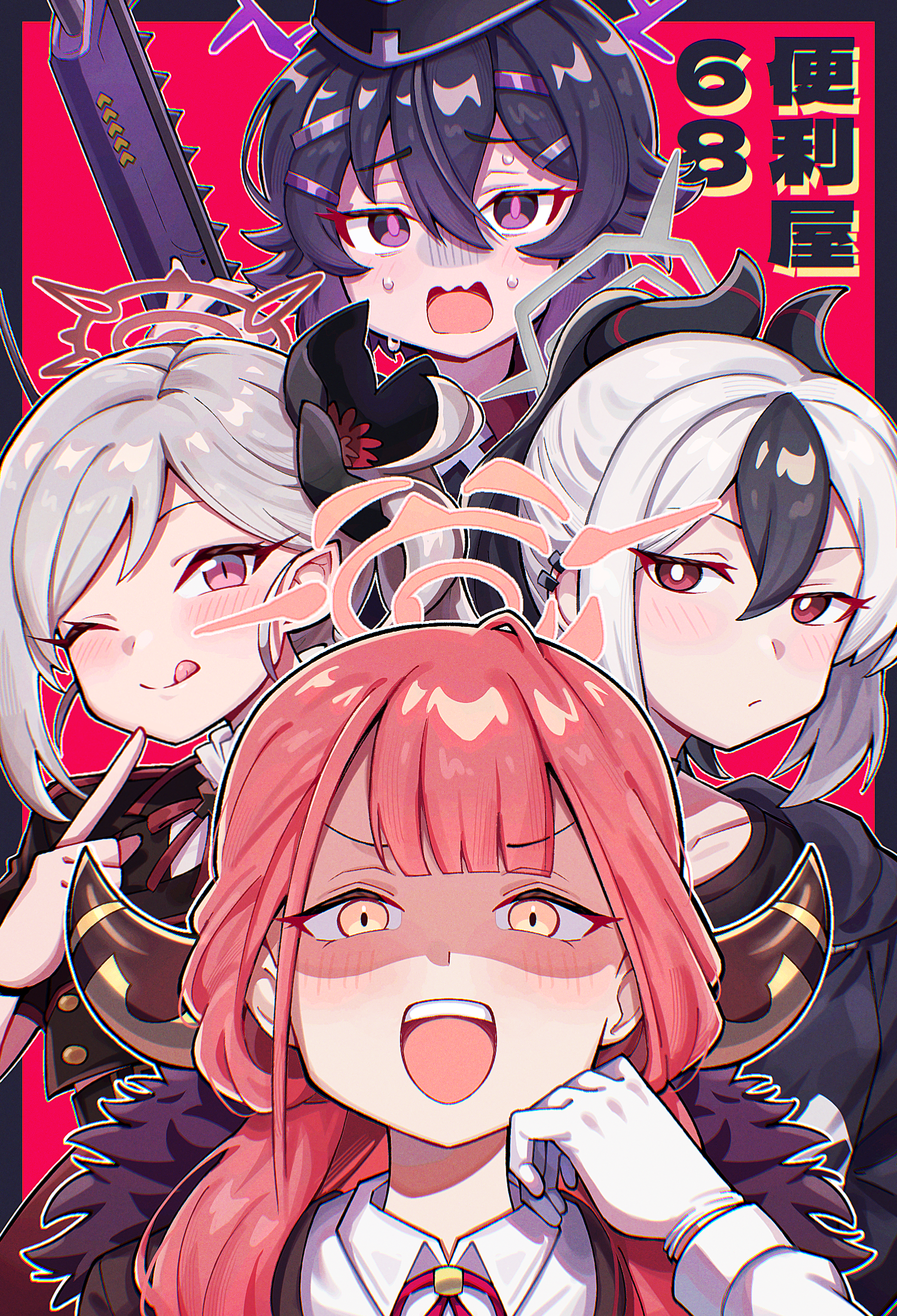 aru_(blue_archive) black_choker black_hair black_hoodie black_horns blue_archive blush brown_horns choker coat coat_on_shoulders demon_horns earclip flower fur_trim grey_halo hair_flower hair_ornament halo haruka_(blue_archive) highres hood hoodie horns kayoko_(blue_archive) mutsuki_(blue_archive) neck_ribbon open_mouth piercing pink_eyes pink_hair pink_halo problem_solver_68_(blue_archive) purple_eyes purple_hair purple_halo red_eyes red_halo red_skirt ribbon sakusaku_ebifurya_(hoshino_3939) skirt sweat tongue tongue_out white_hair yellow_eyes