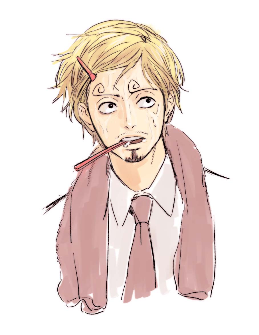 1boy blonde_hair chief_(chiefvinsmoke) collared_shirt commentary_request cropped_torso curly_eyebrows facial_hair goatee hair_ornament hairclip korean_commentary looking_to_the_side male_focus mustache_stubble necktie one_piece pink_necktie sanji_(one_piece) shirt short_hair simple_background solo stubble toothbrush toothbrush_in_mouth white_background white_shirt