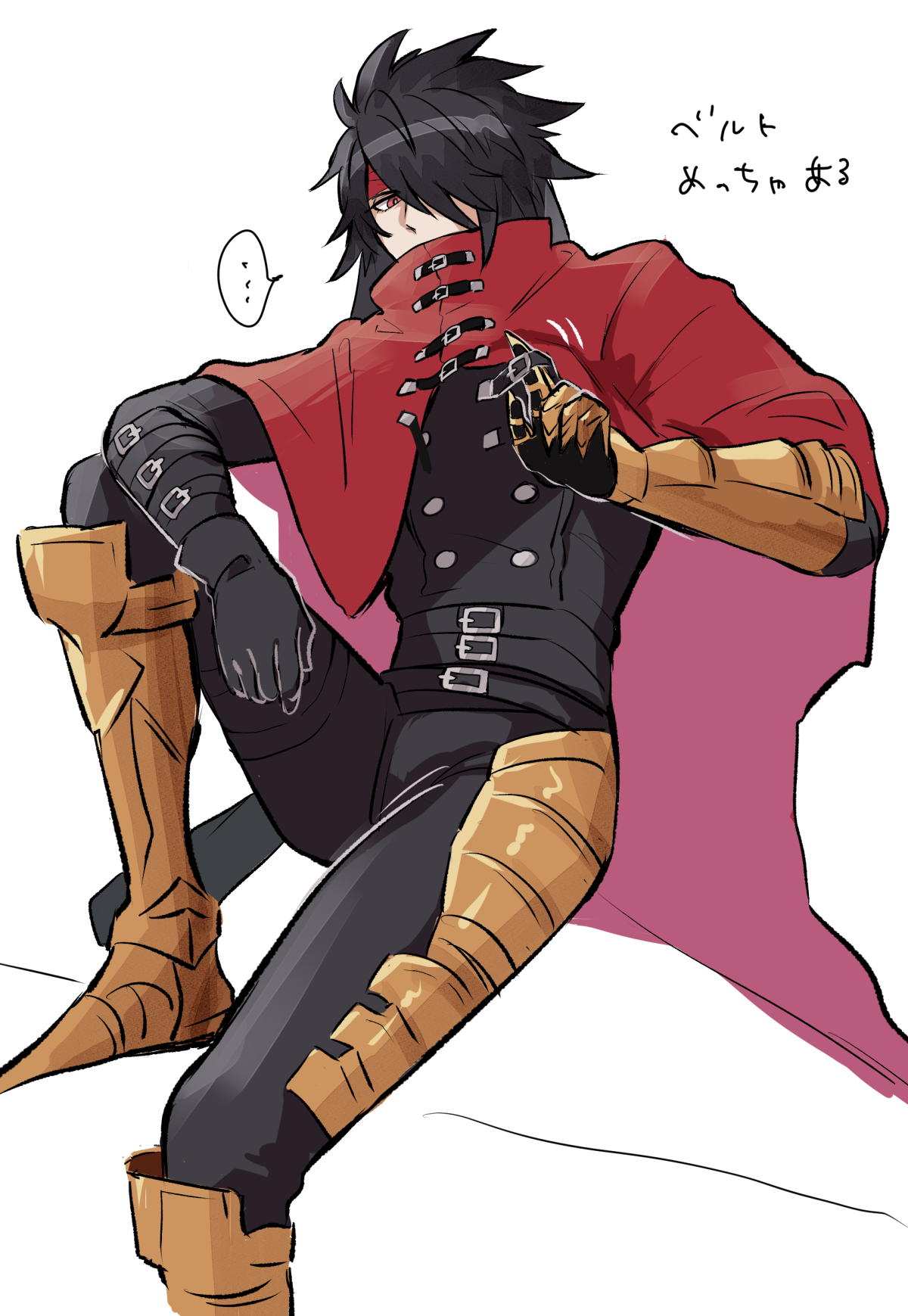 ... 1boy armored_boots az_(pixiv_108058292) belt belt_buckle black_gloves black_hair black_jacket black_pants boots buckle cape clawed_gauntlets cloak commentary_request covered_mouth elbow_rest final_fantasy final_fantasy_vii final_fantasy_vii_rebirth final_fantasy_vii_remake foot_out_of_frame gauntlets gloves headband highres jacket knee_up long_hair male_focus multiple_belts pants red_cape red_cloak red_eyes red_headband single_gauntlet single_glove sitting solo speech_bubble spiked_hair spoken_ellipsis vincent_valentine