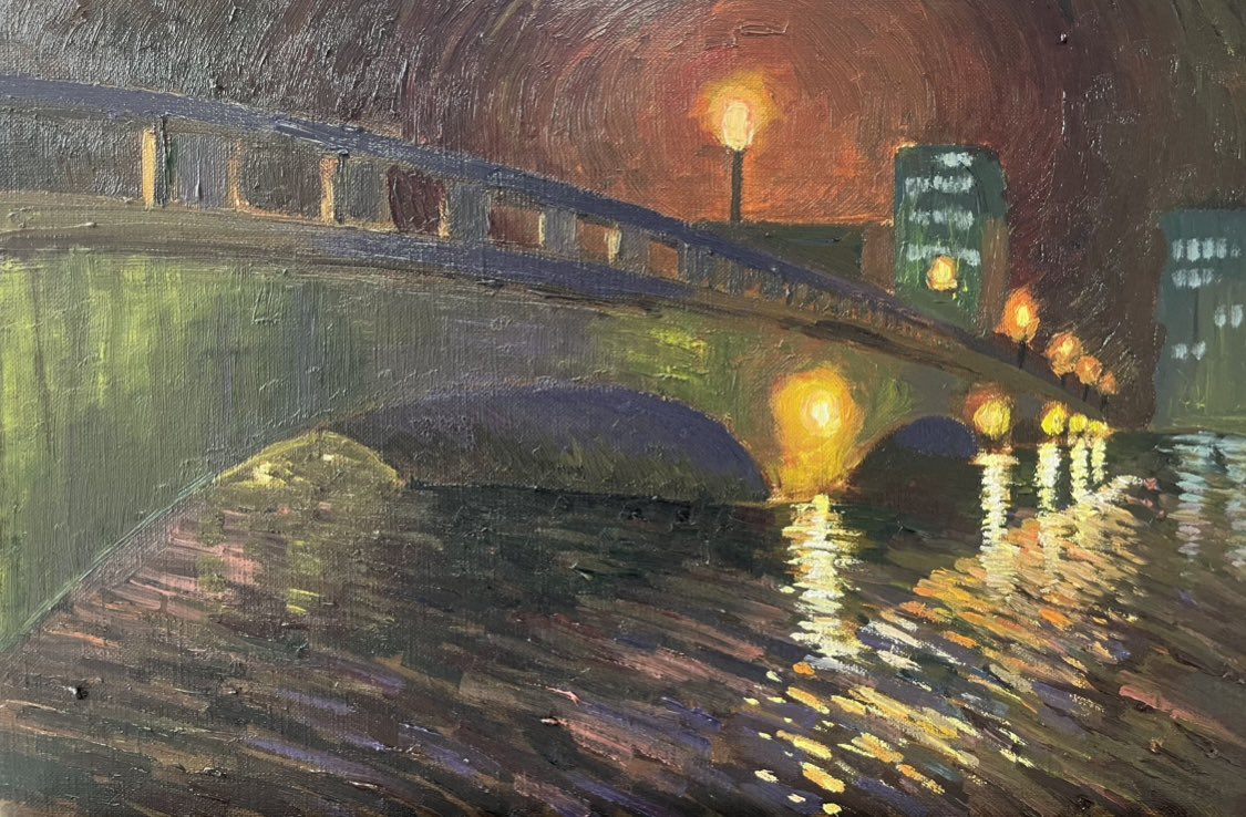 bridge building hinata_orcat lamppost night no_humans oil_painting_(medium) original painting_(medium) railing reflection reflective_liquid sky traditional_media wall_lamp water