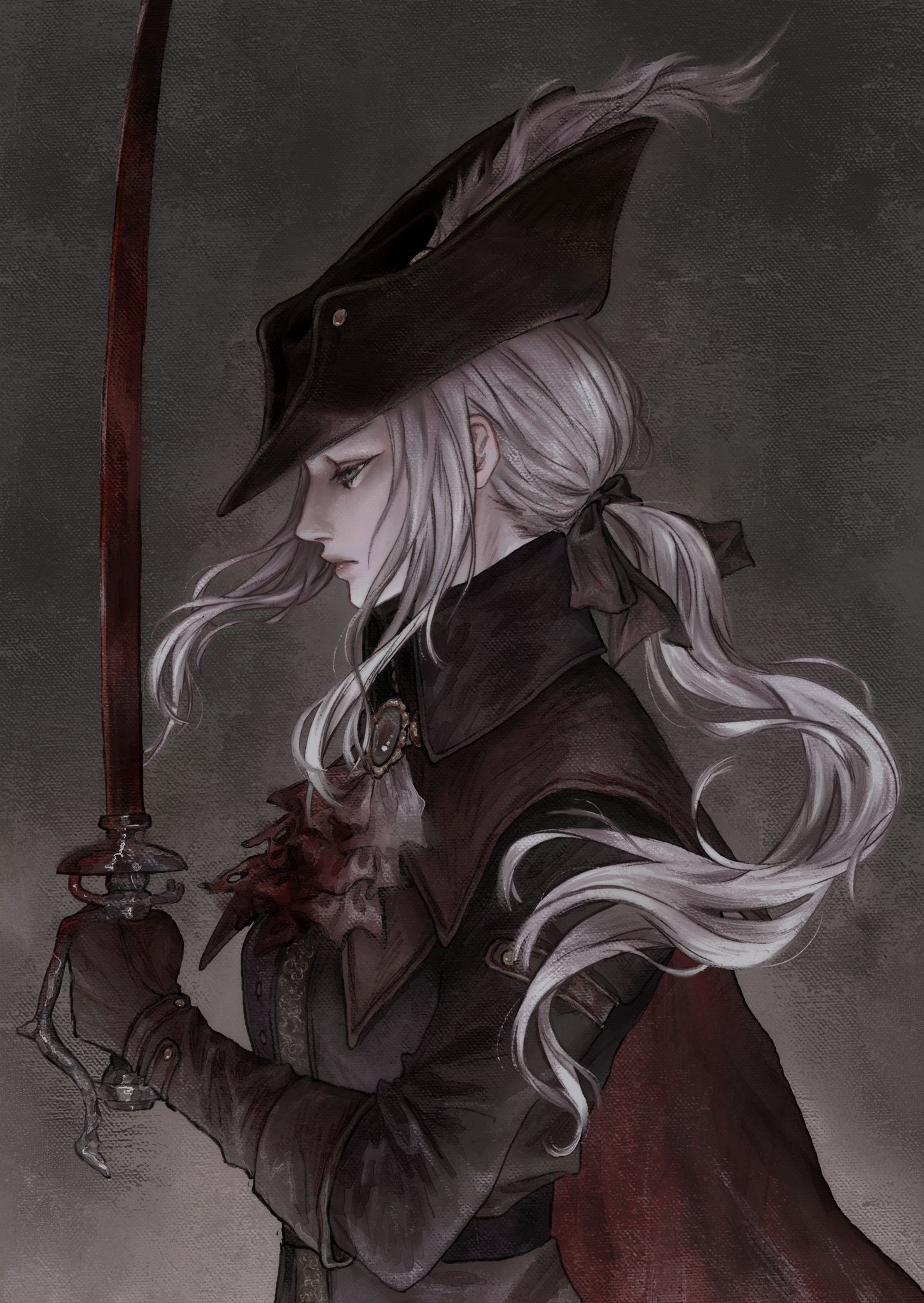 1girl ascot blood blood_on_clothes blood_stain bloodborne cape collared_jacket commentary english_commentary from_side gem grey_background grey_eyes grey_hair hat hat_feather highres jacket lady_maria_of_the_astral_clocktower long_hair looking_down low-tied_long_hair mina_(minalaifey) rakuyo_(bloodborne) sidelocks solo tricorne white_ascot