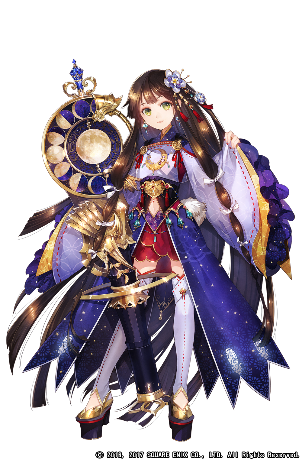 1girl boots brown_hair cannon copyright_notice flower full_body green_eyes grimms_notes hair_flower hair_ornament highres japanese_clothes kaguyahime_(gekkou)_(grimms_notes) kimono kyouka_hatori long_hair official_art rabbit_tail red_thighhighs ribbon_trim sash sidelocks simple_background smile solo swept_bangs tail thigh_boots thighhighs very_long_hair weapon white_background