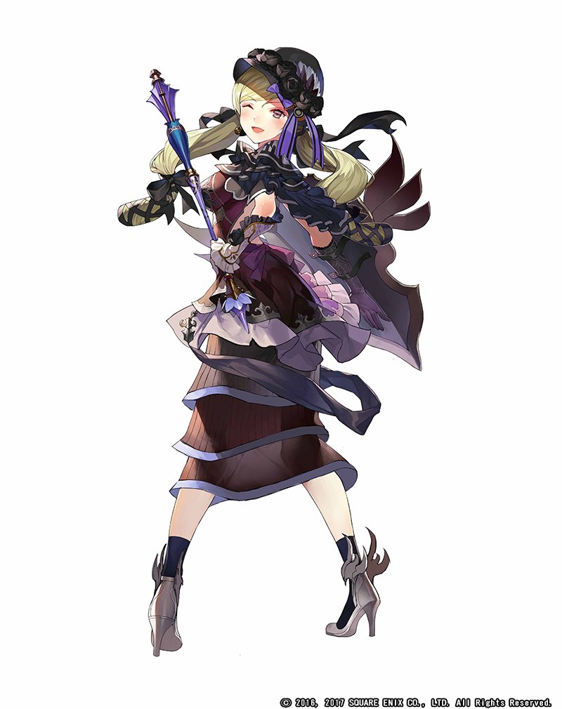 1girl black_ribbon black_socks blonde_hair breasts copyright_notice full_body gaou_(umaiyo_puyoman) gloves grimms_notes hat high_heels holding holding_mace holding_shield holding_weapon large_breasts mace madame_cat_(grimms_notes) official_alternate_costume official_art purple_eyes purple_ribbon ribbon see-through_clothes shield simple_background socks solo weapon white_background