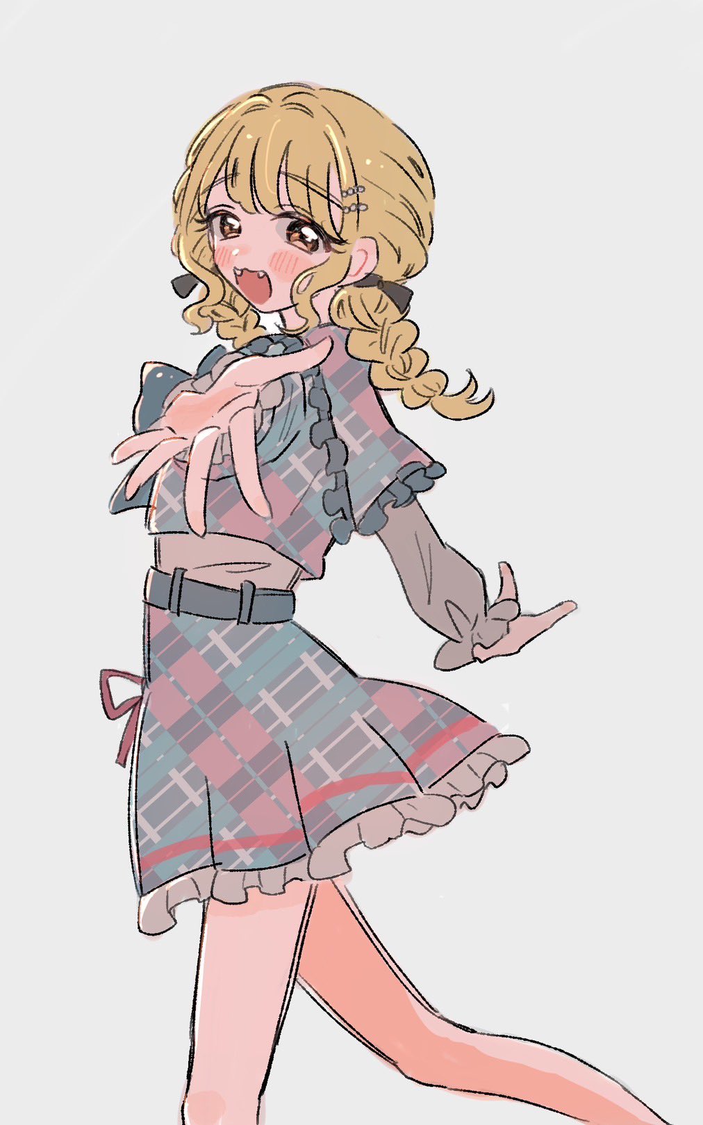 1girl bare_legs beckoning blonde_hair braid cropped_jacket fangs feet_out_of_frame fujita_kotone gakuen_idolmaster hashtag-only_commentary highres idolmaster looking_at_viewer looking_to_the_side naname_che_bomb petticoat shirt simple_background solo twin_braids white_background white_shirt yellow_eyes