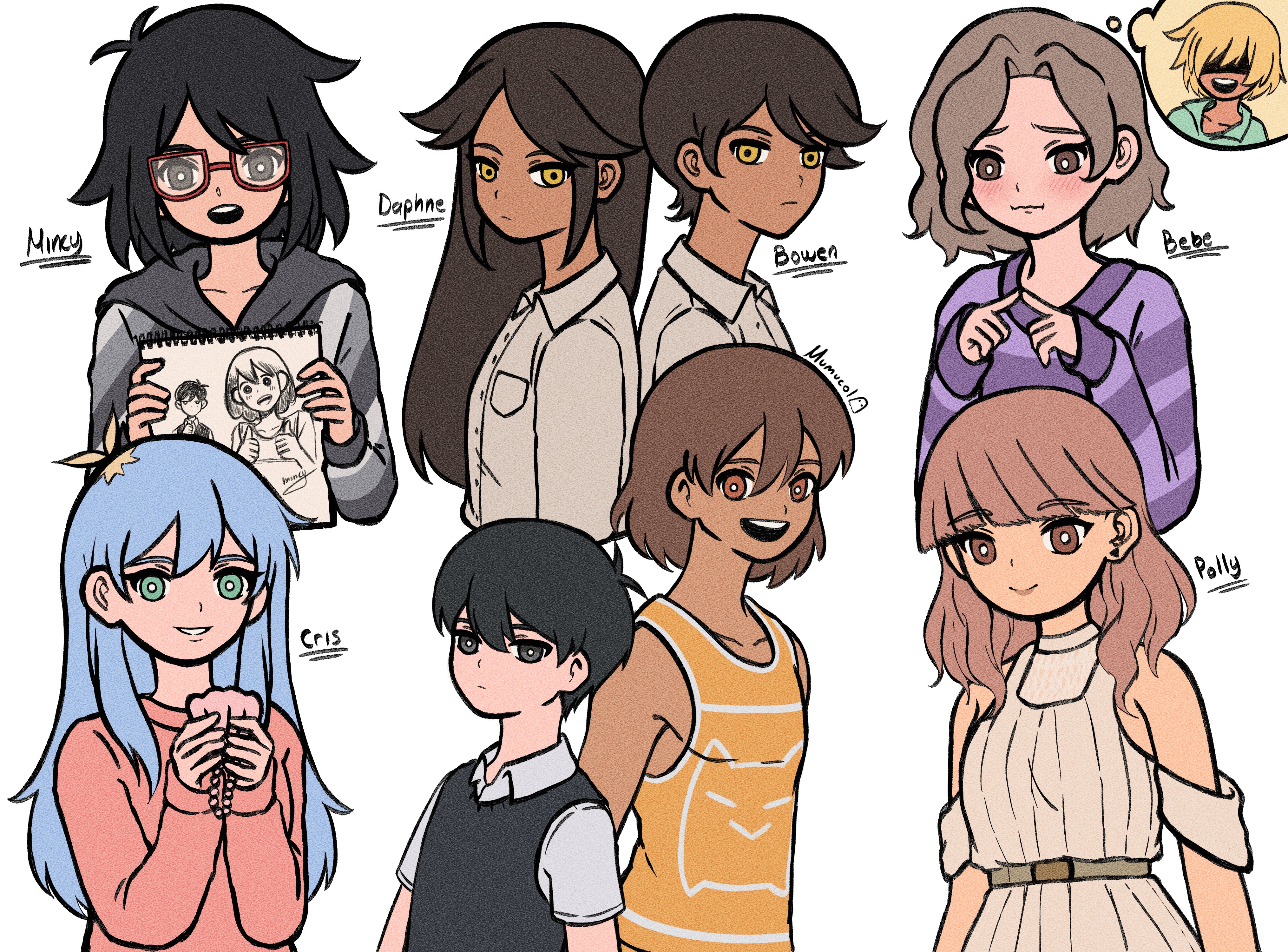 3boys 5girls absurdres bebe_(omori) black_eyes black_hair blunt_bangs bowen_(omori) bright_pupils brown_eyes brown_hair closed_eyes collarbone collared_shirt cris_(omori) daphne_(omori) dark-skinned_female dark-skinned_male dark_skin ear_piercing glasses green_eyes grey_hoodie highres holding holding_sketchbook hood hood_down hoodie kel_(faraway)_(omori) kel_(omori) long_hair long_sleeves medium_hair mikhael_(omori) mincy_(omori) multiple_boys multiple_girls mumucol omori open_mouth parted_bangs piercing pink_sweater polly_(omori) purple_sweater red-framed_eyewear shirt short_hair simple_background sketchbook speech_bubble sunny_(omori) sweater teeth thought_bubble upper_teeth_only white_background white_pupils white_shirt