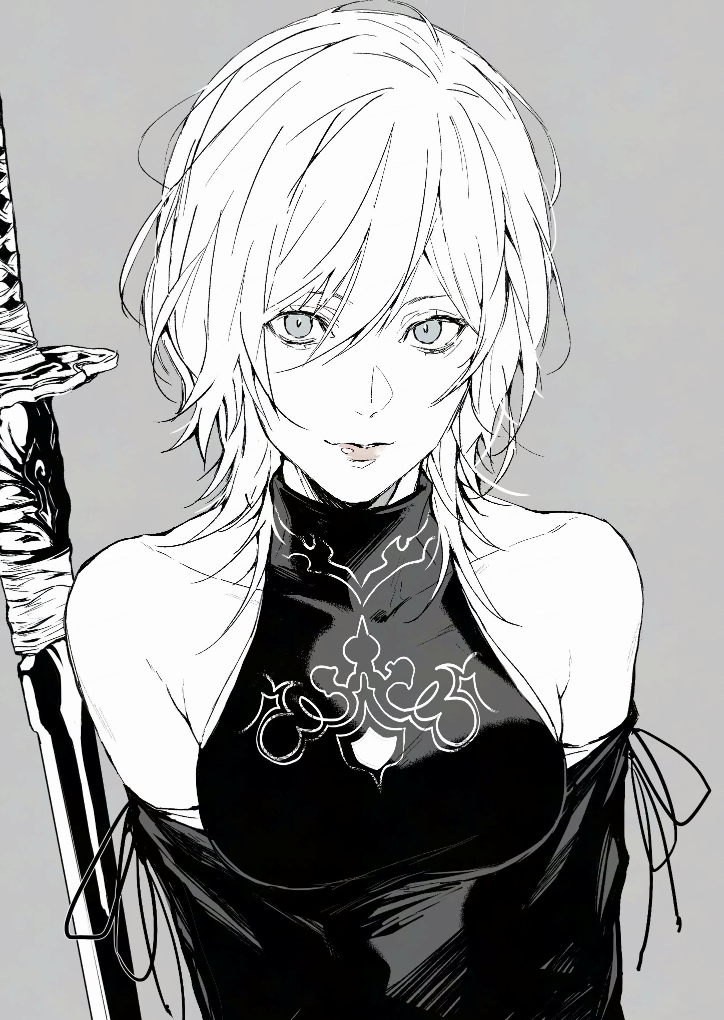 bare_shoulders breasts character_request cleavage_cutout clothing_cutout collarbone highres looking_at_viewer medium_breasts medium_hair monochrome nier:automata nier_(series) nishiii26miii partially_colored simple_background sword weapon wispy_bangs