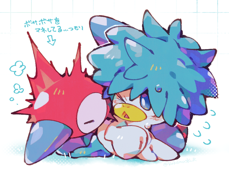 blue_eyes blue_hair blush closed_eyes gen_2_pokemon kokemushi_(kuru_fox) lying nintendo no_humans open_mouth pokemon pokemon_(creature) porygon2 quaxly simple_background sweat white_background
