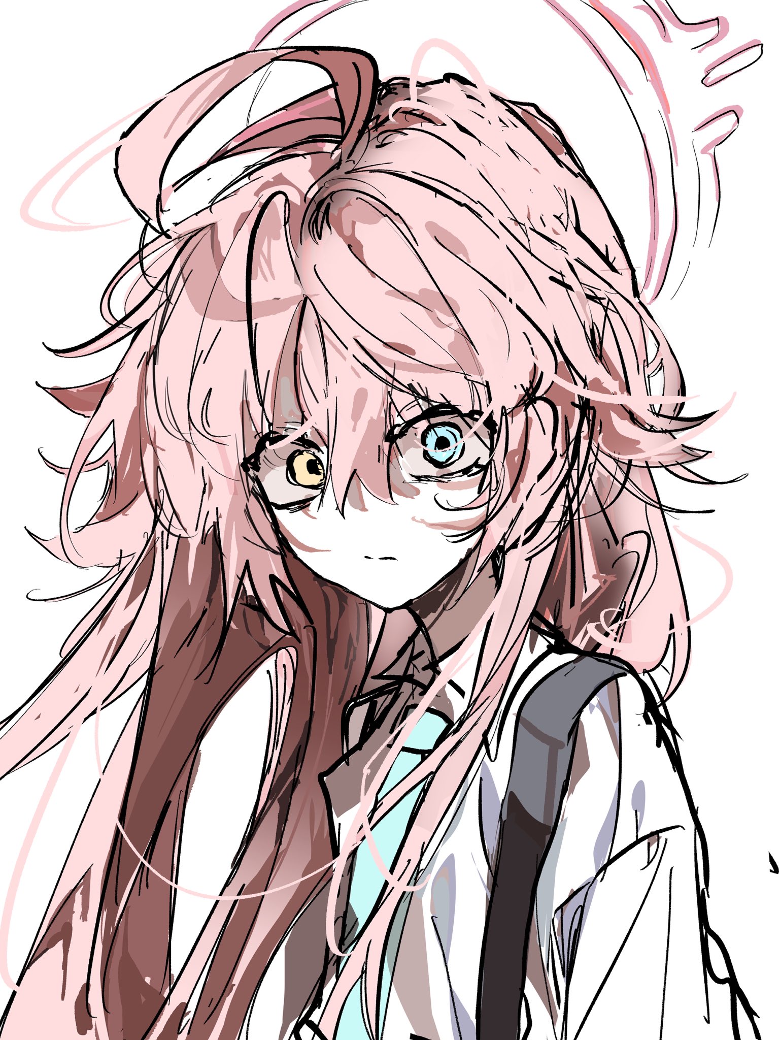 1girl antenna_hair blue_archive blue_necktie collared_shirt engmuu_125 halo heterochromia highres hoshino_(blue_archive) necktie pink_hair pink_halo shirt simple_background solo upper_body white_background white_shirt wide-eyed