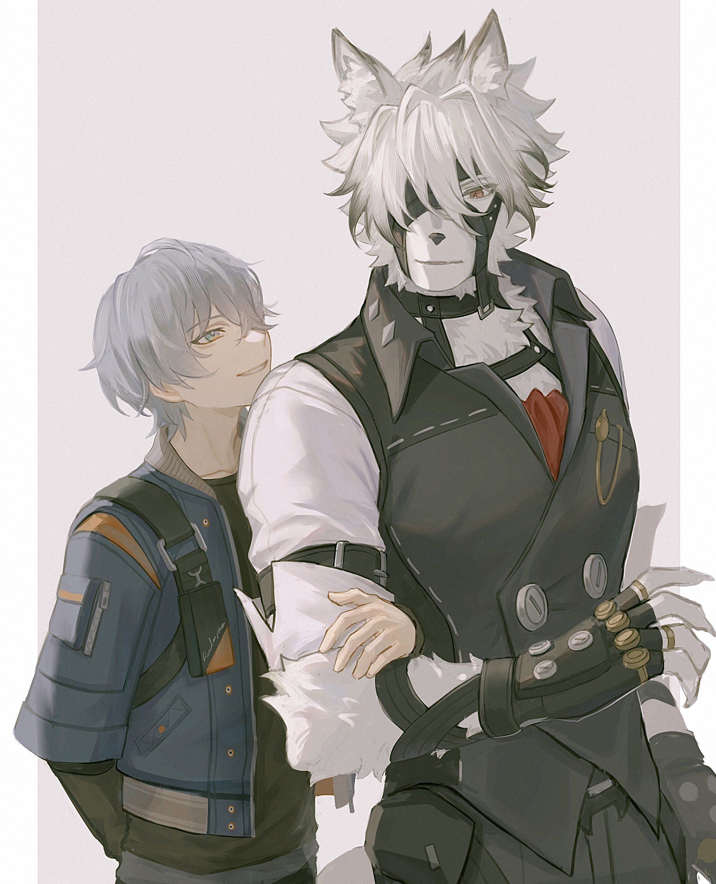 2boys absurdres arm_belt arm_up ascot belt black_belt black_gloves black_pants black_shirt black_vest claws closed_mouth commentary_request couple cowboy_shot fingerless_gloves gloves grey_eyes grey_hair hair_over_one_eye hand_on_another's_arm highres jacket layered_sleeves long_sleeves looking_at_another male_focus multicolored_jacket multiple_belts multiple_boys one_eye_covered pants parted_lips red_ascot red_eyes shirt short_over_long_sleeves short_sleeves smile studded_gloves uowsaou vest von_lycaon white_shirt wing_collar wise_(zenless_zone_zero) yaoi zenless_zone_zero
