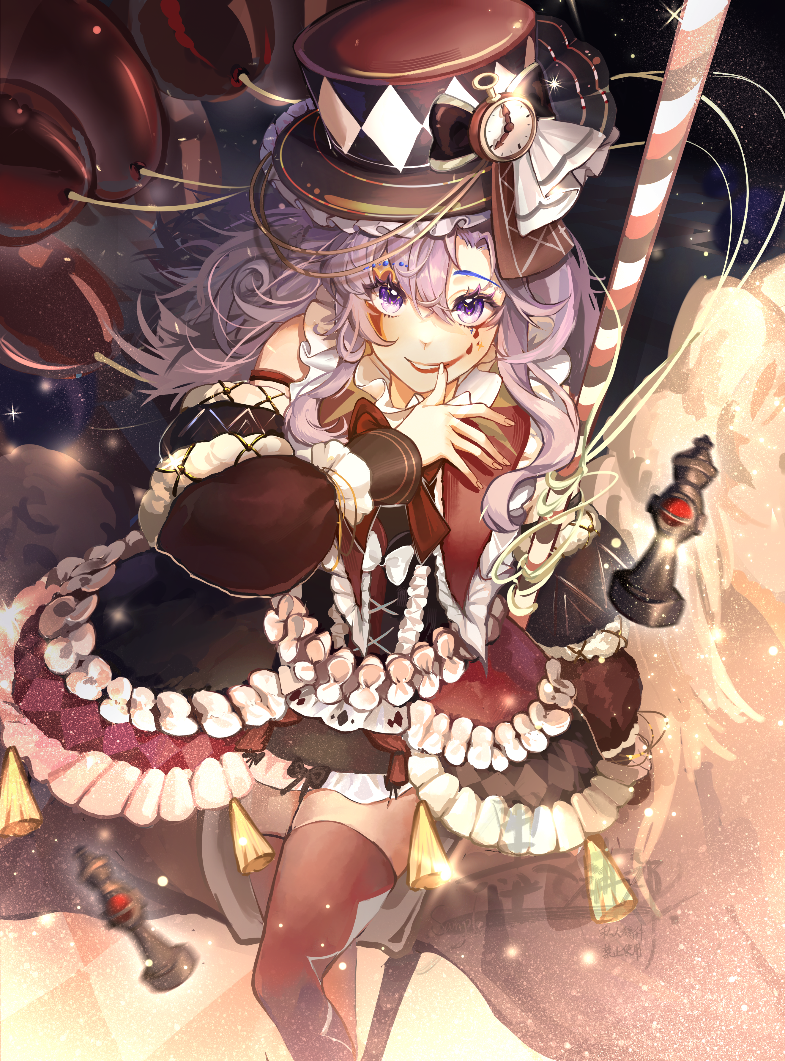1girl absurdres artist_name balloon bare_shoulders carousel chess_piece commission dark_background dress facial_mark feet_out_of_frame frilled_dress frills grin hand_up hat heart heart_facial_mark highres lipstick lolita_fashion long_sleeves looking_at_viewer makeup original pocket_watch pole puffy_long_sleeves puffy_sleeves purple_eyes purple_hair red_dress red_hat red_lips red_thighhighs short_dress sidesaddle signature sitting smeared_lipstick smile solo teardrop_facial_mark thighhighs top_hat watch wiping_mouth youzha_ligui