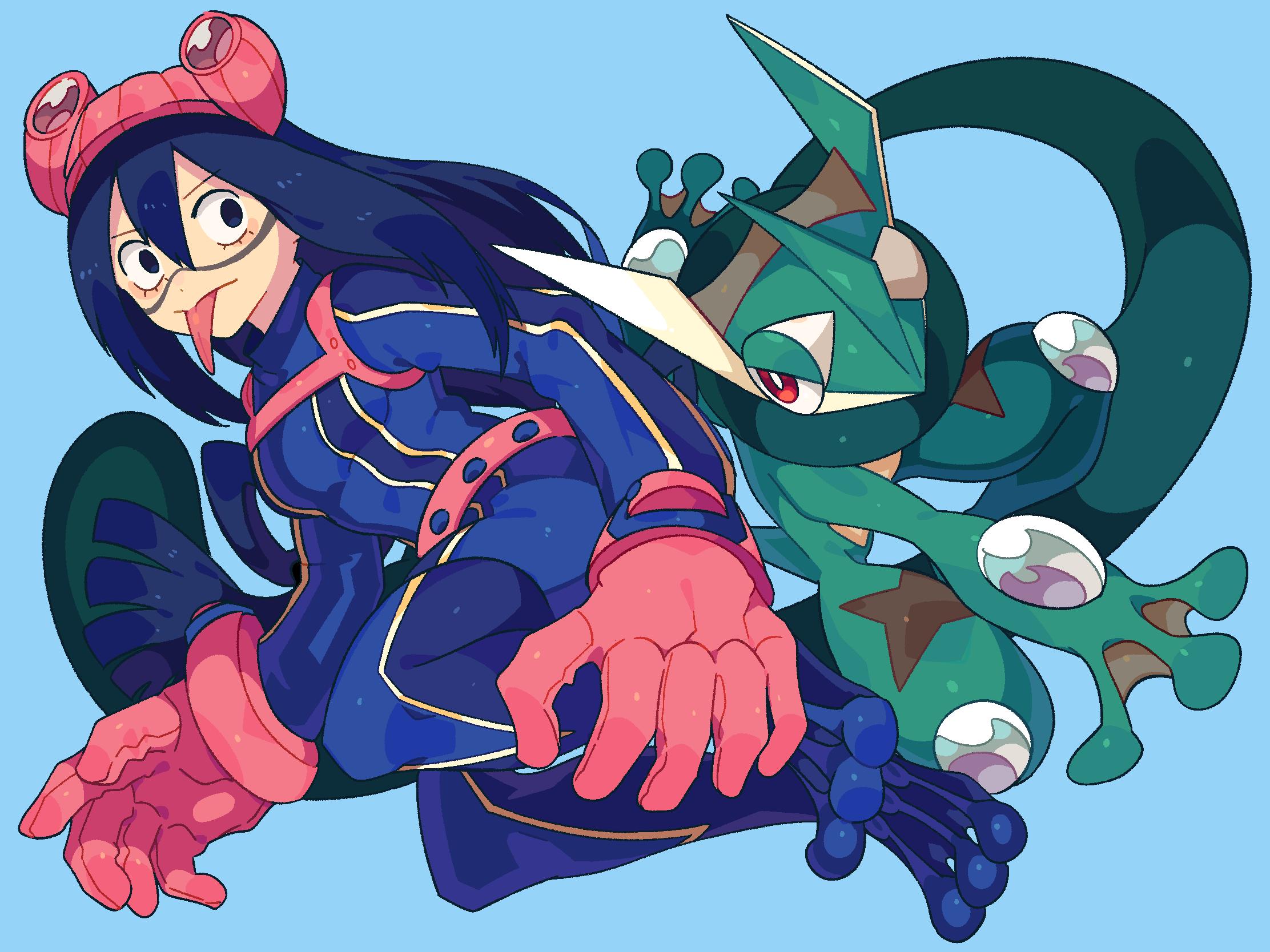 1girl alternate_color asui_tsuyu asui_tsuyu_(hero_outfit) blue_background blue_hair boku_no_hero_academia bright_pupils commission full_body gloves goggles goggles_on_head hair_between_eyes highres long_hair long_tongue nintendo pink_gloves pokemon pokemon_(creature) red_eyes simple_background superhero_costume tongue tongue_out white_pupils yasaikakiage