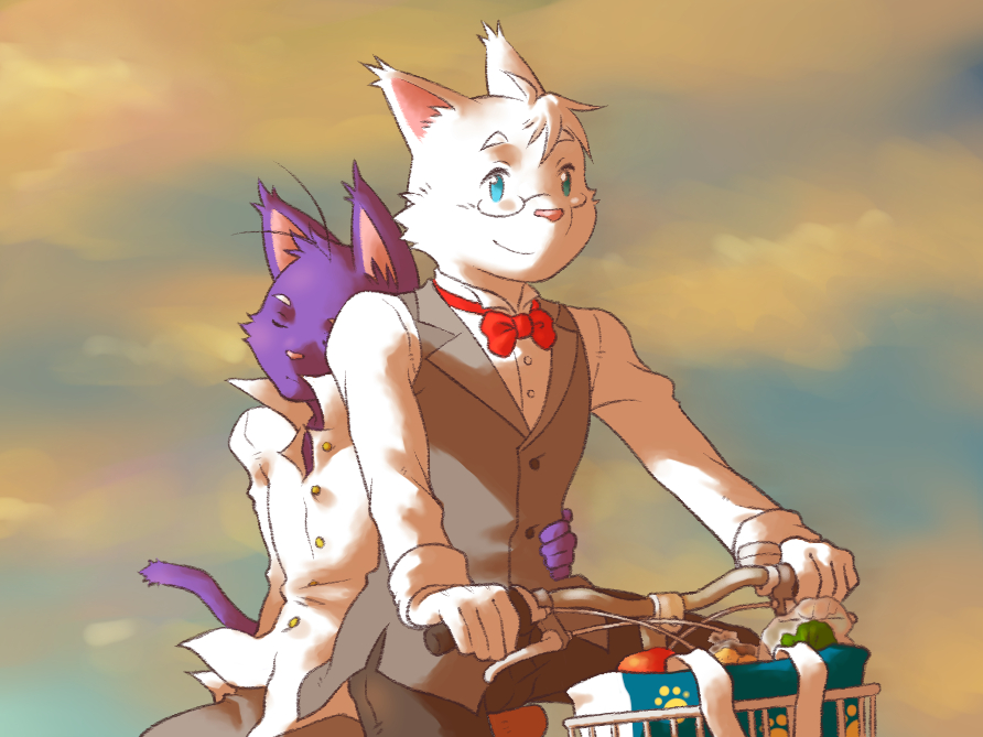2boys ahoge animal_ears bicycle black_pants bow bowtie cat_boy cat_ears cat_tail closed_eyes closed_mouth cloud commentary_request dusk furry furry_male grey_pants grey_vest hand_on_another's_waist male_focus morenatsu multiple_boys pants red_bow red_bowtie riding riding_bicycle round_eyewear shin_kuroi shirako_(kirupi) shirt sleeping smile tail tsukishiro_amaki vest white_shirt