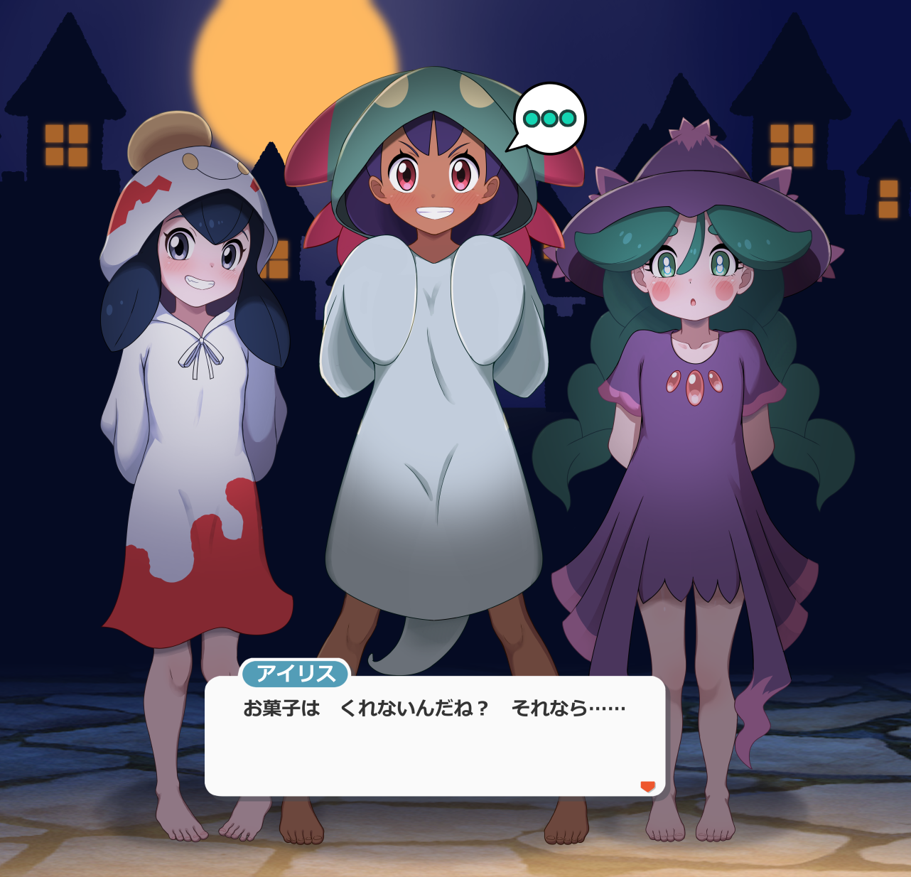 ... 3girls :o barefoot blue_eyes blue_hair blush chimecho chimecho_(cosplay) clenched_teeth commentary_request cosplay dark-skinned_female dark_skin dreepy dreepy_(cosplay) dress full_body gen_3_pokemon gen_4_pokemon gen_8_pokemon green_eyes green_hair halloween_costume highres iris_(pokemon) kohatsuka liza_(pokemon) looking_at_viewer mismagius mismagius_(cosplay) moon multiple_girls night nintendo open_mouth pokemon pokemon_black_and_white pokemon_legends:_arceus pokemon_omega_ruby_and_alpha_sapphire purple_hair red_eyes sabi_(pokemon) sky smile standing teeth translation_request
