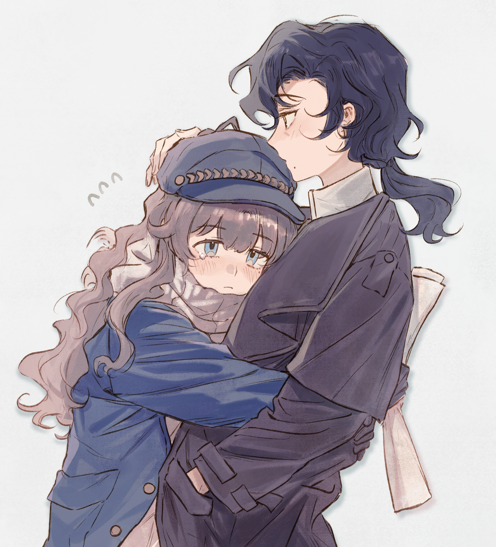 2girls arms_around_waist black_hair blue_coat blue_eyes blush brown_coat brown_gloves brown_hair newsboy_cap canis428 closed_mouth coat curly_hair from_side gloves greta_hofmann grey_hat hand_in_pocket hand_on_another's_head hat highres holding holding_paper hug long_hair long_sleeves low_ponytail marcus_(reverse:1999) medium_hair mole mole_under_mouth multiple_girls paper rolled-up_paper ponytail reverse:1999 scarf shirt tearing_up white_background white_scarf white_shirt